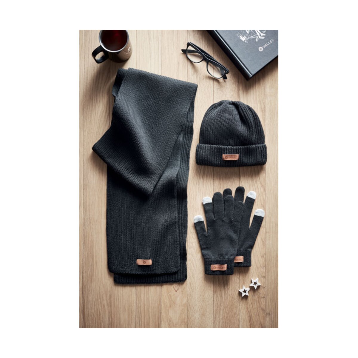 Czapka z lekko elastycznego, oddychającego poliestru chroni głowę przed wiatrem i mrozem, zachowując jednocześnie nowoczesny, sportowo-miejski charakter. Szalik o optymalnej długości otula szyję miękką warstwą materiału, blokując dostęp zimnego powietrza. Największym atutem są rękawiczki z funkcją obsługi ekranów dotykowych, które umożliwiają swobodne korzystanie ze smartfona bez ryzyka odmrożenia dłoni. Każdy element posiada starannie wszytą etykietę przeznaczoną do nadruku, na której Twoja firma może umieścić logo, slogan lub hasło reklamowe – dzięki temu zestaw staje się skutecznym nośnikiem marketingowym.