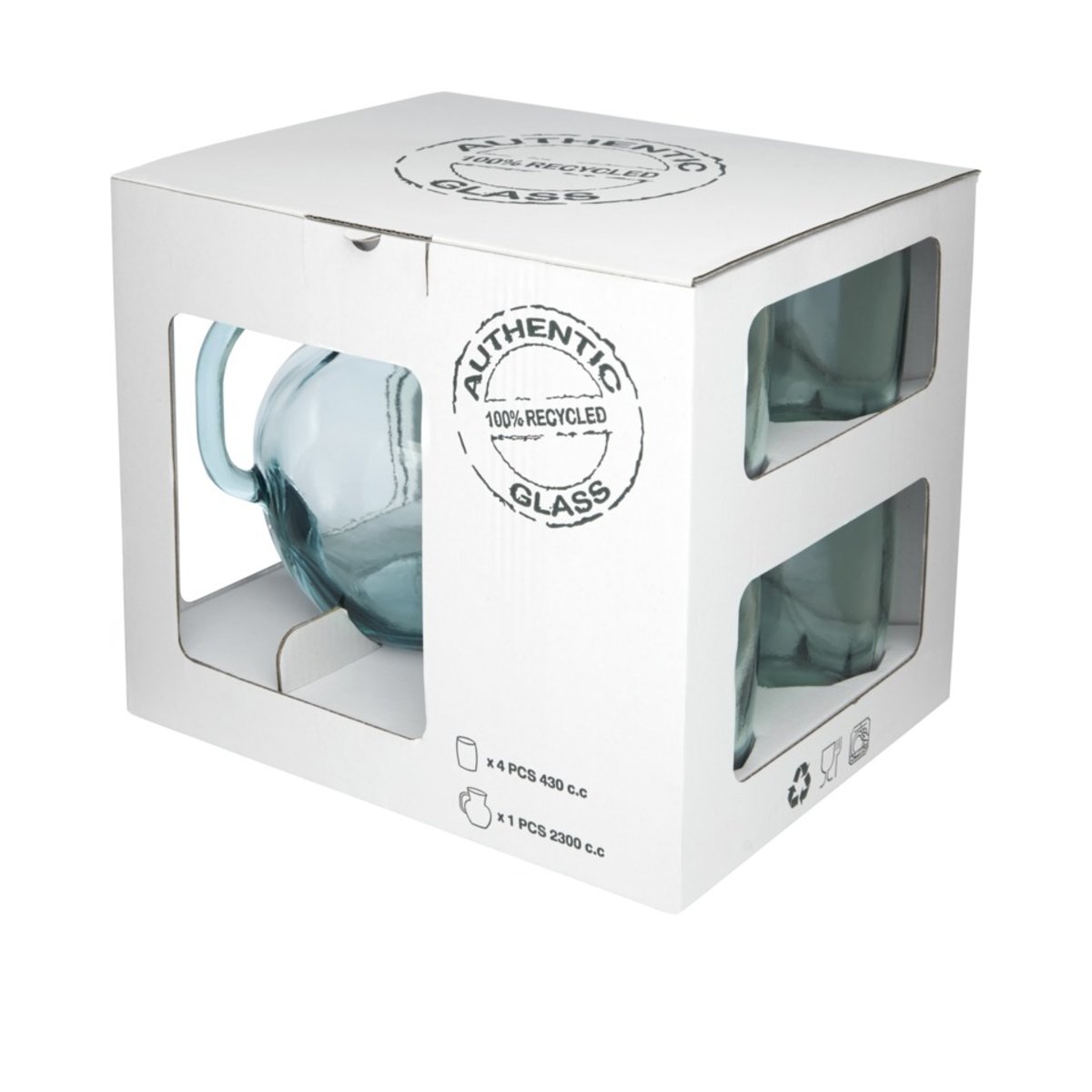 5-częściowy zestaw szkła z recyclingu Terazza to unikalne połączenie ekologii, funkcjonalności i elegancji, które zachwyci zarówno miłośników stylowych dodatków do domu, jak i firmy poszukujące nieszablonowych gadżetów reklamowych. W skład kompletu wchodzi obszerny szklany słoik 2,3 l z praktycznym uchwytem oraz cztery solidne kubki 430 ml, powstałe łącznie z aż 5 przetworzonych butelek. Dzięki wykorzystaniu surowca z recyklingu przy produkcji zużyto mniej energii i wody, co czyni zestaw przyjaznym środowisku 🌿.