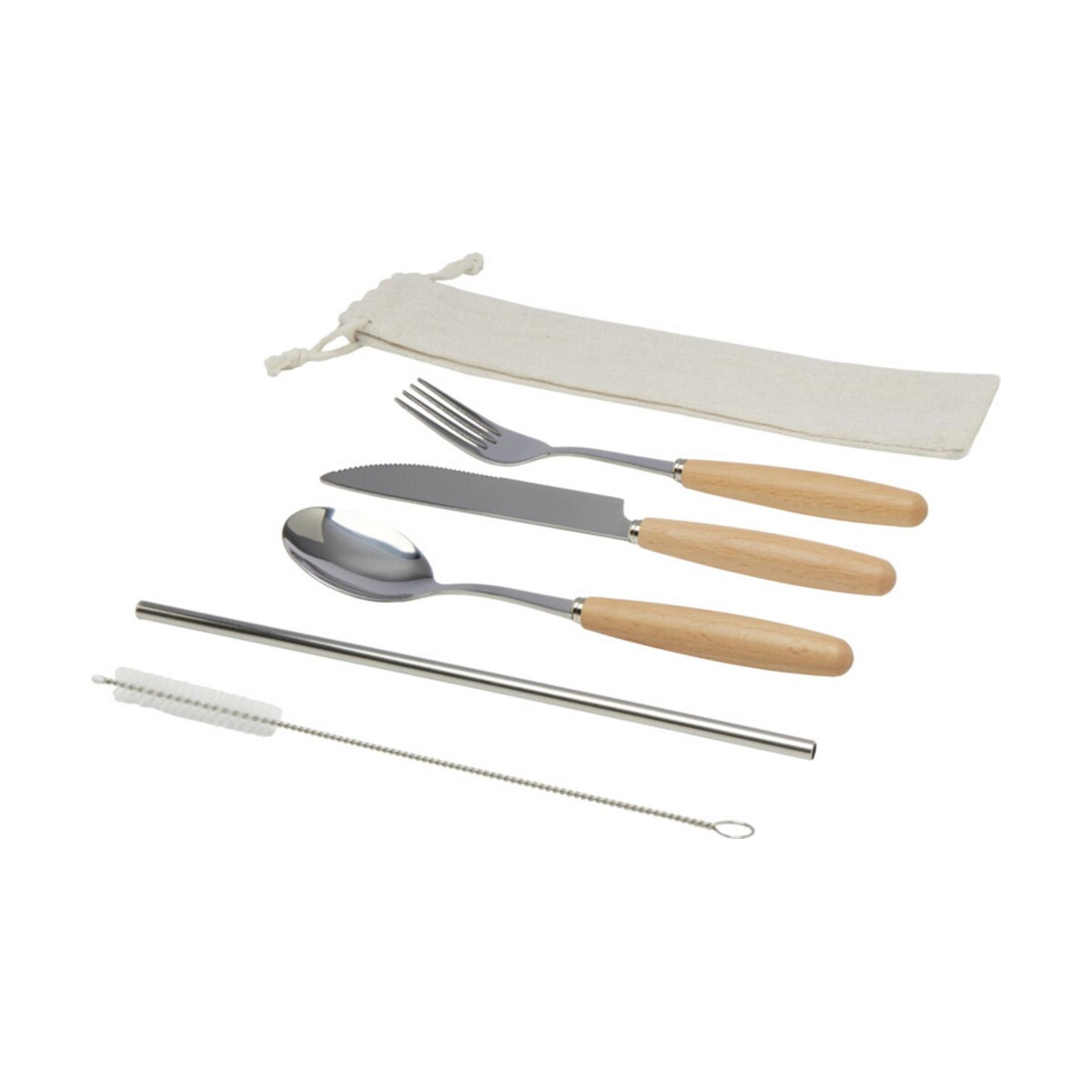 5-częściowy zestaw sztućców ze stali nierdzewnej i z drewna bukowego Root to prawdziwie wszechstronny gadżet, który przyciąga uwagę nie tylko eleganckim wyglądem, lecz także funkcjonalnością 🌿. W komplecie znajdziesz widelec, nóż, łyżkę, metalową słomkę oraz szczoteczkę do jej czyszczenia – wszystko w wygodnym bawełnianym woreczku. Całość waży zaledwie 104 g i mierzy 24,5 × 6 cm, dzięki czemu zmieści się w torbie na lunch, plecaku turystycznym czy w szufladzie biurka. Metalowe części wykonane ze stali nierdzewnej są trwałe i łatwe do utrzymania w czystości, a rękojeści z naturalnego drewna bukowego nadają całości ciepły, ekologiczny charakter.