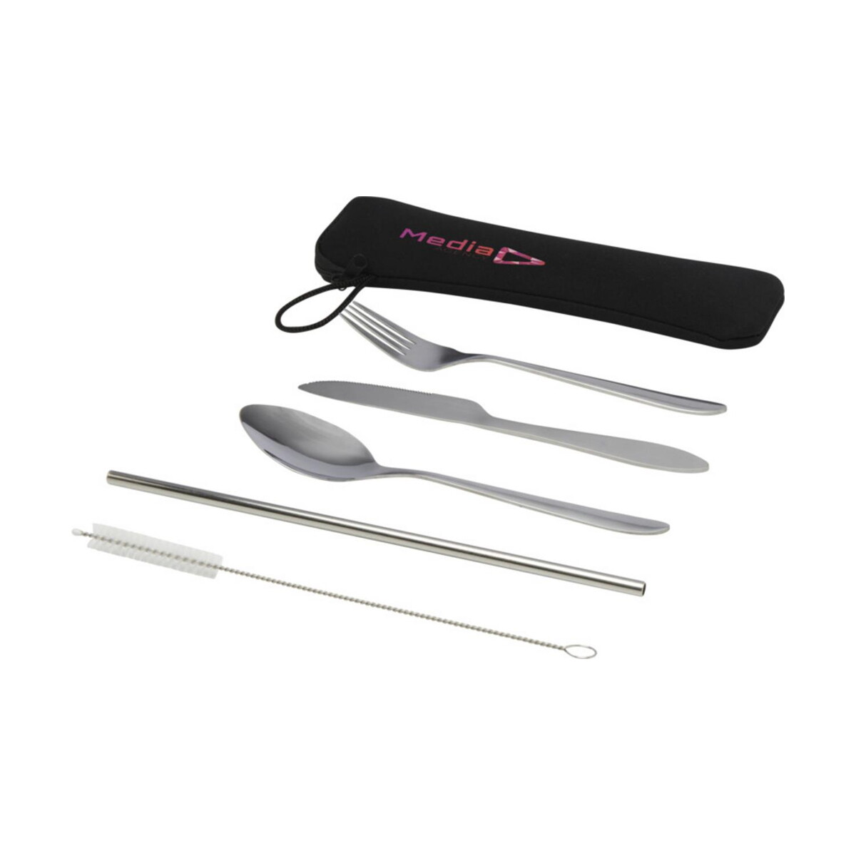 5-częściowy zestaw sztućców ze stali nierdzewnej Sheen to wyjątkowo praktyczny, a zarazem elegancki gadżet stworzony z myślą o codziennym serwowaniu posiłków oraz o akcjach promocyjnych. W skład kompletu wchodzą: widelec, nóż, łyżka, słomka oraz szczoteczka do jej czyszczenia – wszystkie wykonane z trwałej stal nierdzewna, odpornej na korozję i łatwej do mycia. Całość mieści się w zamykanym na suwak etui z neoprenu w modnym szarym kolorze, które dzięki poręcznemu sznurkowi można wygodnie przypiąć do plecaka czy torby. Kompaktowe wymiary 21,5 x 6,5 cm oraz niewielka waga jedynie 0,95 g sprawiają, że to rozwiązanie jest wręcz doskonałe 😊 do zabrania do biura, w podróż lub na piknik.
