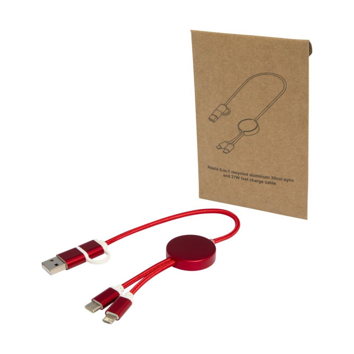 Podsumowując, Alasia kabel do synchronizacji danych i szybkiego ładowania 5 w 1 27 W o długości 30 cm z tworzyw sztucznych i aluminium pochodzących z recyklingu to perfekcyjna propozycja na reklamowe wsparcie wizerunku marki. Zapewnij swoim klientom lub pracownikom nowoczesne narzędzie, które każdego dnia będzie przypominać o Twoim profesjonalizmie i trosce o środowisko.