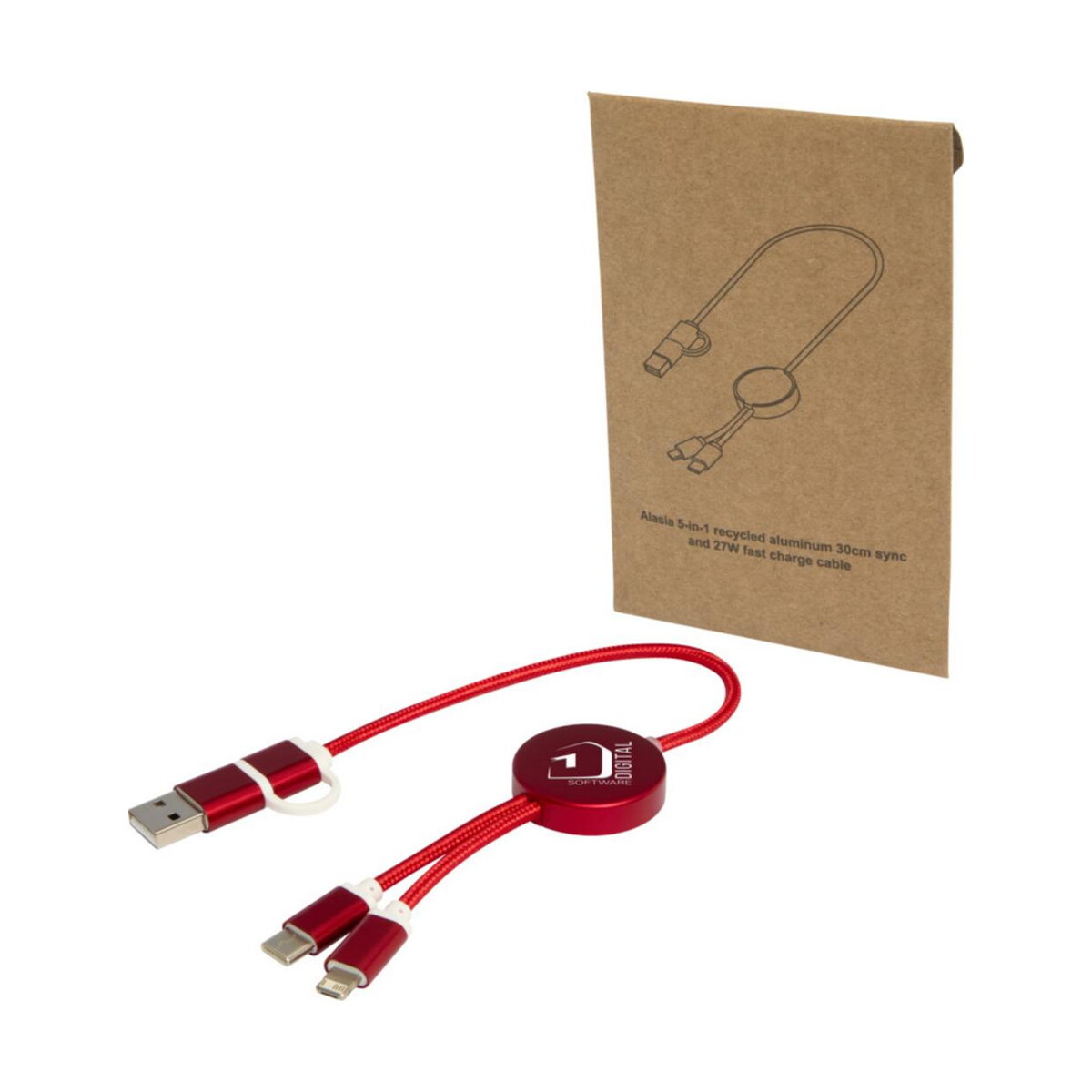 Alasia kabel do synchronizacji danych i szybkiego ładowania 5 w 1 27 W o długości 30 cm z tworzyw sztucznych i aluminium pochodzących z recyklingu to nowoczesny gadżet, który łączy ekologię z funkcjonalnością. Dzięki kompaktowej długości 30 cm i wadze zaledwie 20 g sprawdzi się w domu, biurze oraz podczas podróży 🚀. Wykonany z wysokiej klasy Recycled Aluminium i tworzyw z recyklingu jest znakomitym przykładem zrównoważonego podejścia do technologii. Dostępny w czterech eleganckich kolorach – czerwonym, szarym, niebieskim oraz czarnym – stanie się estetycznym dodatkiem na każdym biurku.
