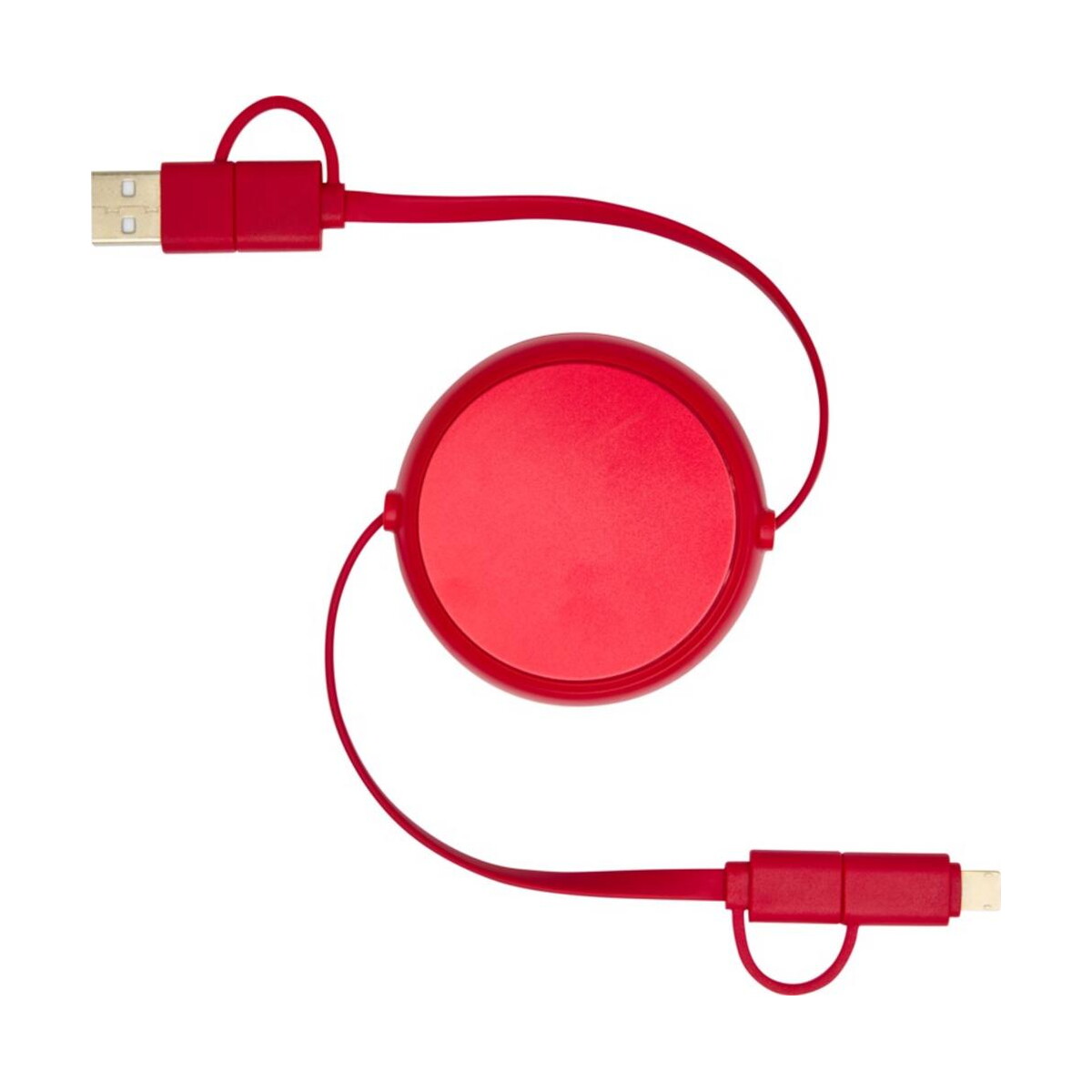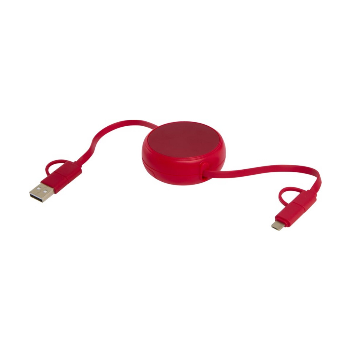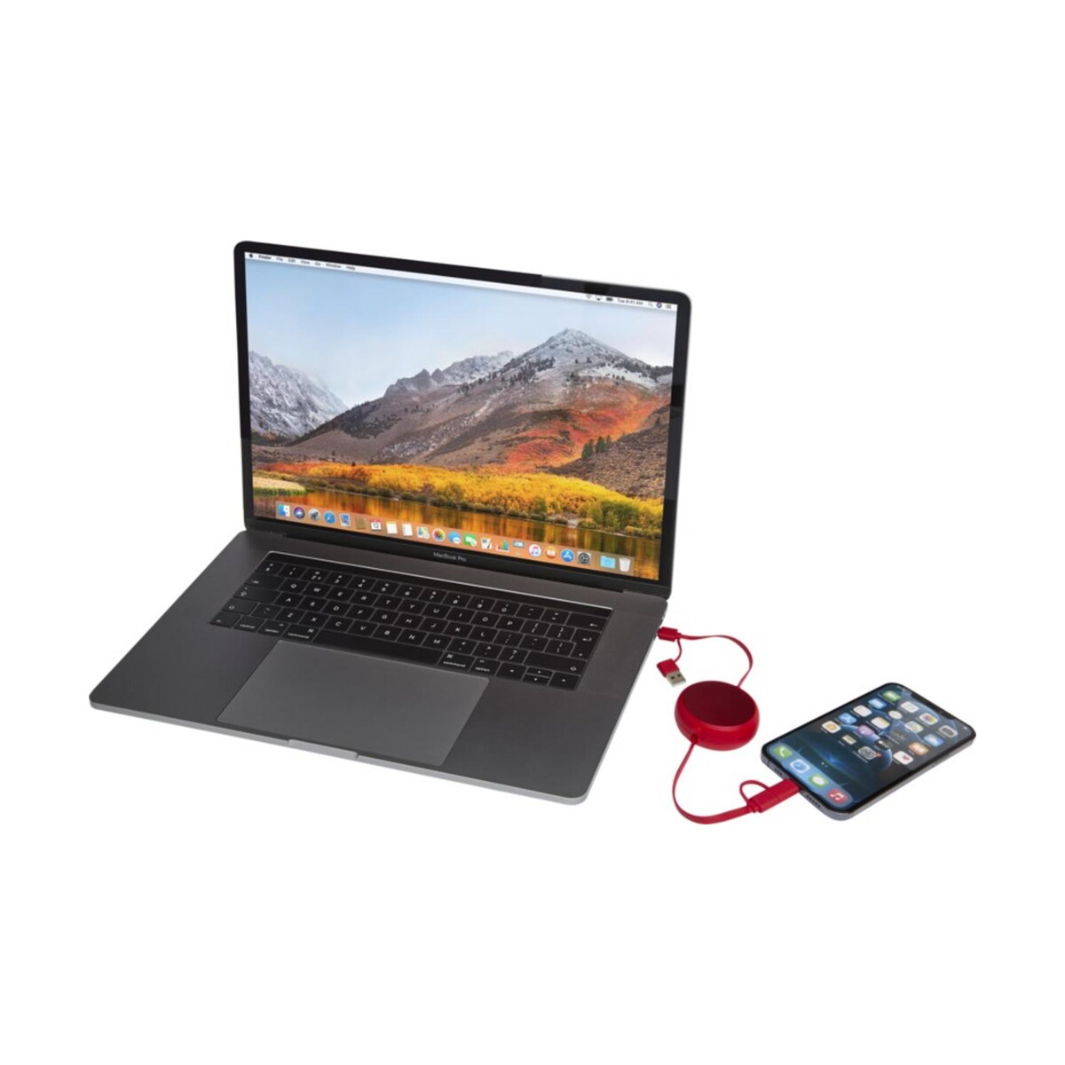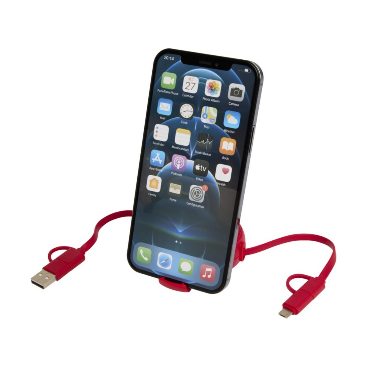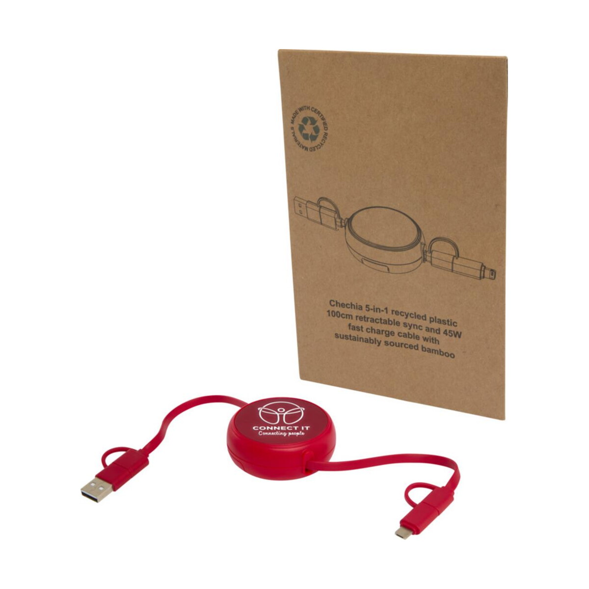 Alasia zwijany kabel do synchronizacji danych i szybkiego ładowania 5 w 1 45 W o długości 100 cm z tworzyw sztucznych i aluminium pochodzących z recyklingu to nowoczesny, wielozadaniowy gadżet, który zachwyca funkcjonalnością oraz ekologicznym charakterem. Wykonany z Recycled Aluminium i ABS-u z odzysku, jest nie tylko lekki – waży zaledwie 51 g – ale i wytrzymały, a cztery kolory (czerwony, szary, niebieski, czarny) pozwalają dopasować go do identyfikacji wizualnej Twojej firmy.