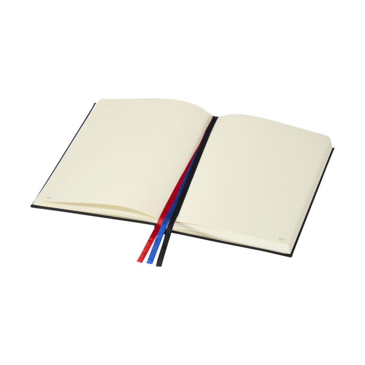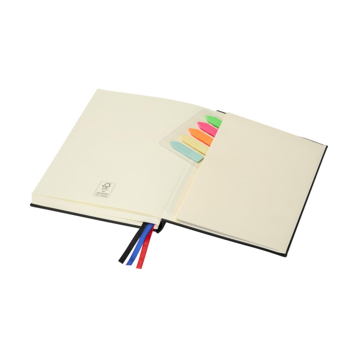 Notes posiada dwie gumki do zamykania, trzy wstążkowe zakładki w kontrastowych kolorach oraz 200 kolorowych karteczek samoprzylepnych, które ułatwiają organizację informacji. Dodatkowa kieszonka na luźne notatki i eleganckie wytłoczone logo JournalBooks na tylnej okładce dopełniają całości. Solidna konstrukcja (wymiary 21,5 × Ø 15,3 cm, waga 605 g) oraz papier z certyfikatem FSC certified paper sprawiają, że jest to wybór jednocześnie stylowy i przyjazny środowisku.