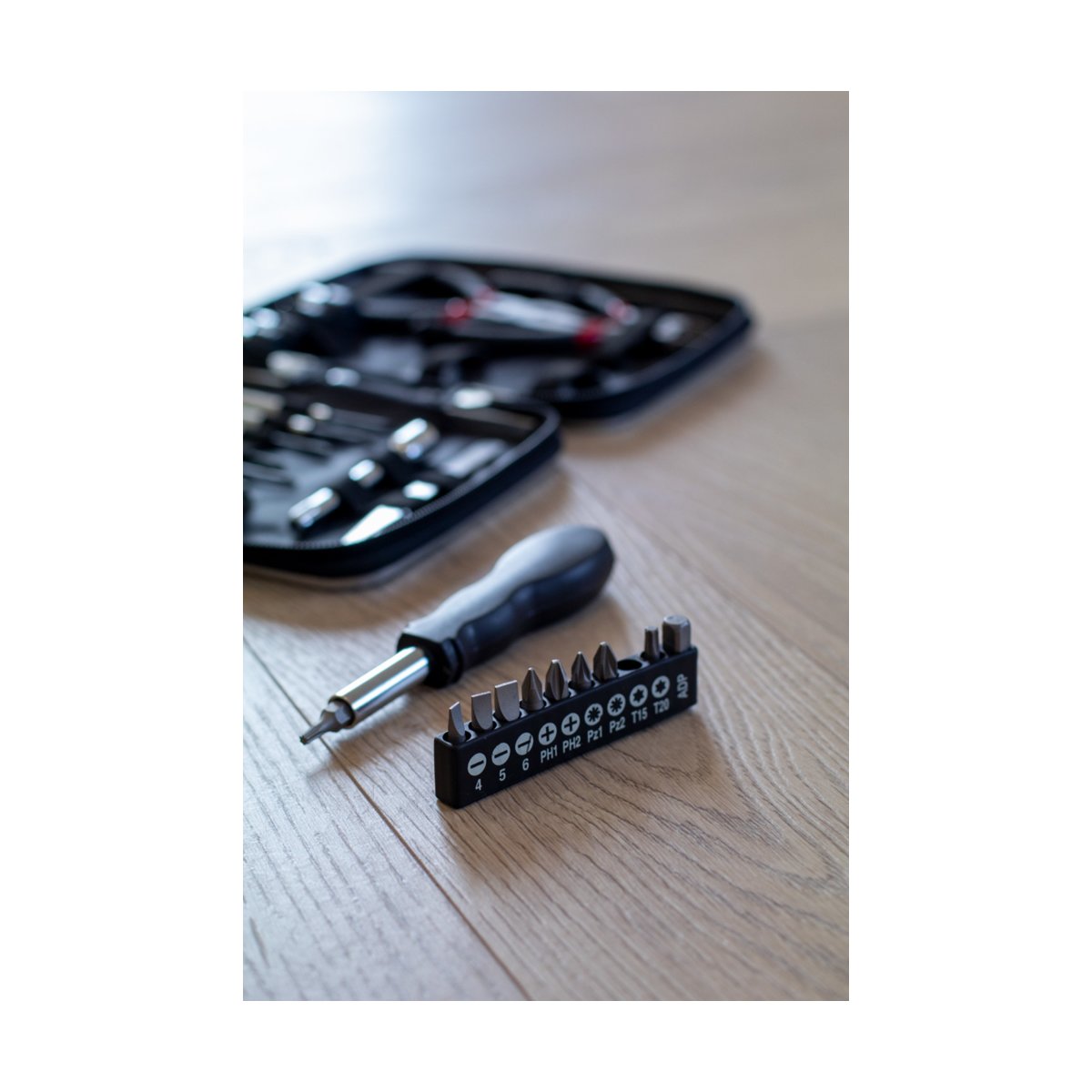 Aldrin – zestaw narzędzi to kompaktowe, 25-częściowe centrum serwisowe zamknięte w eleganckiej, aluminiowej walizce na suwak. Dzięki solidnej konstrukcji z metalu zestaw gwarantuje długą żywotność i niezawodność nawet przy intensywnym użytkowaniu. Walizka w kolorze czarnym stanowi idealną powierzchnię pod nadruk Twojego logo, dlatego Aldrin – zestaw narzędzi doskonale sprawdza się jako gadżet reklamowy dla firm z branży motoryzacyjnej, budowlanej, logistycznej, a także IT, które chcą podkreślić swoją dbałość o jakość i praktyczne rozwiązania.