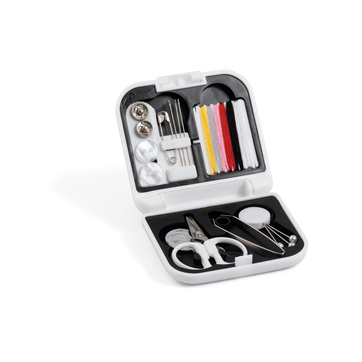 Wygodny i lekki podróżny zestaw do szycia. Składa się z 3 szpilek, 3 igieł, 1 pary pęset, 1 pary nożyczek, 1 nawlekacza, 1 agrafki, 2 guzików, 2 zamknięć na haftki i 6 szpulek nici w kilku kolorach. Dostarczany w twardym etui