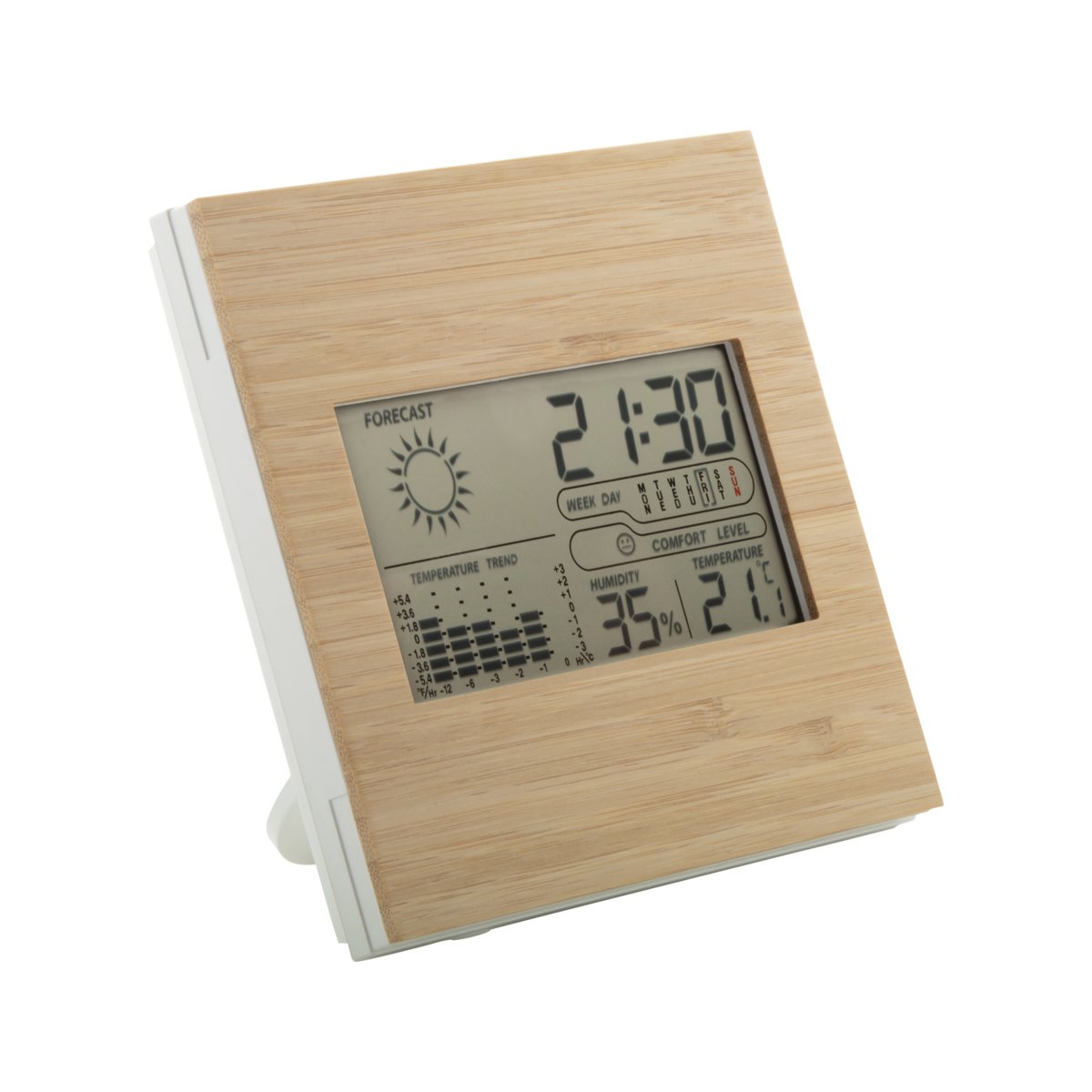 Boocast – bambusowa stacja pogodowa to ekologiczny, wielofunkcyjny gadżet, który łączy w sobie termometr, higrometr, budzik, kalendarz oraz wyjątkowo przydatną pamięć trendów temperatury. Naturalny front wykonany z certyfikowanego bambusa 🌿 nadaje urządzeniu niepowtarzalny charakter, a zarazem stanowi idealną powierzchnię pod eleganckie logo Twojej marki. Dzięki zasilaniu na 2 baterie AAA sprzęt działa niezawodnie przez długi czas, gwarantując, że Twój przekaz reklamowy będzie widoczny każdego dnia.