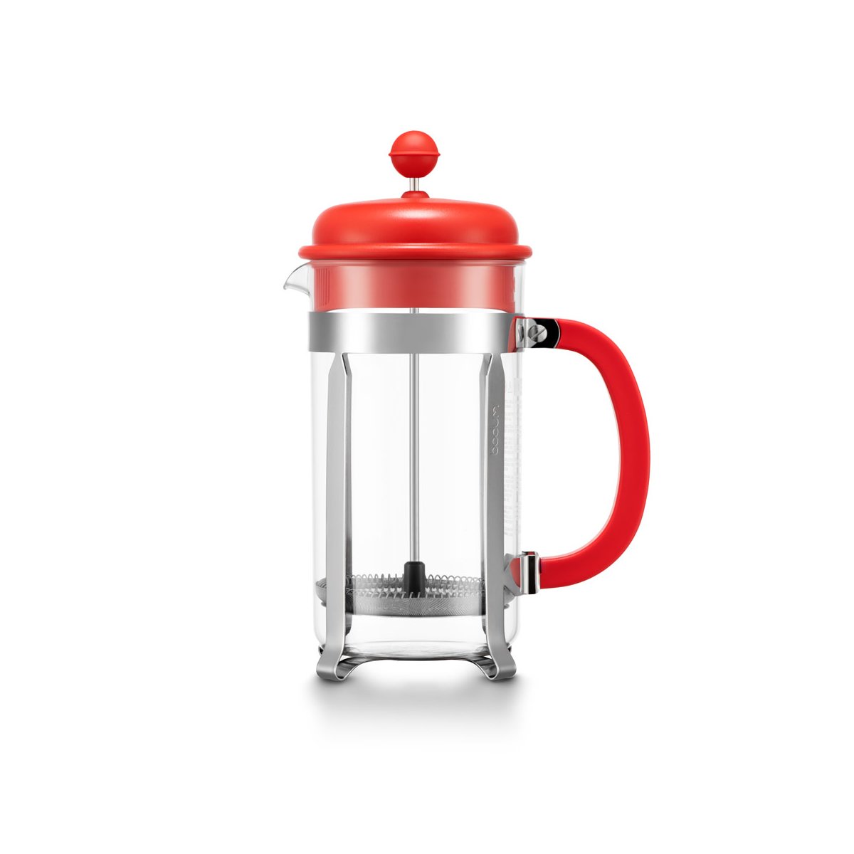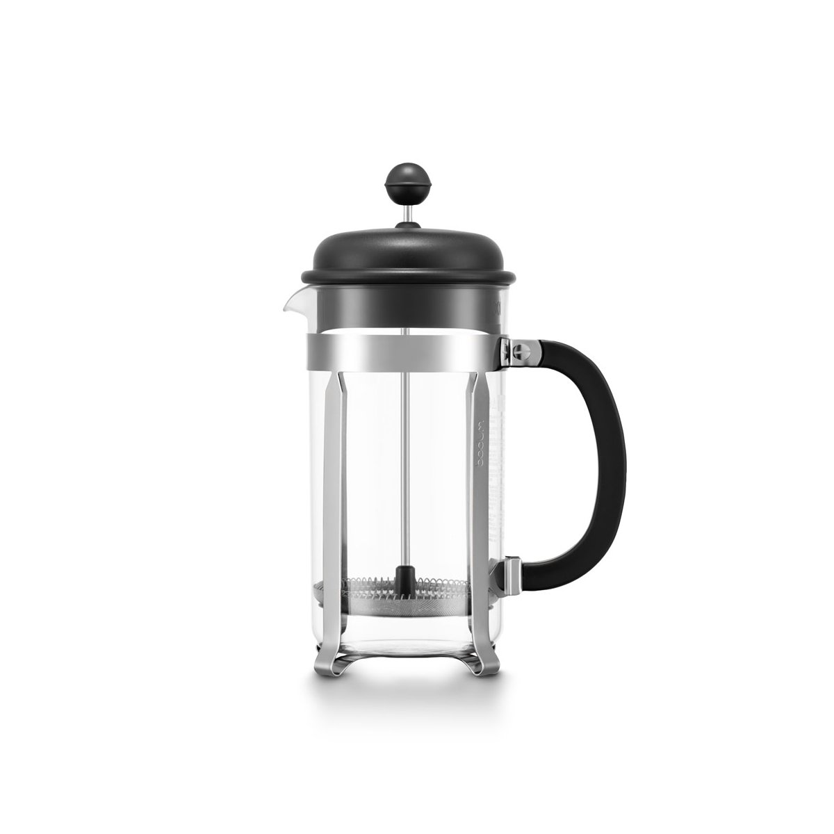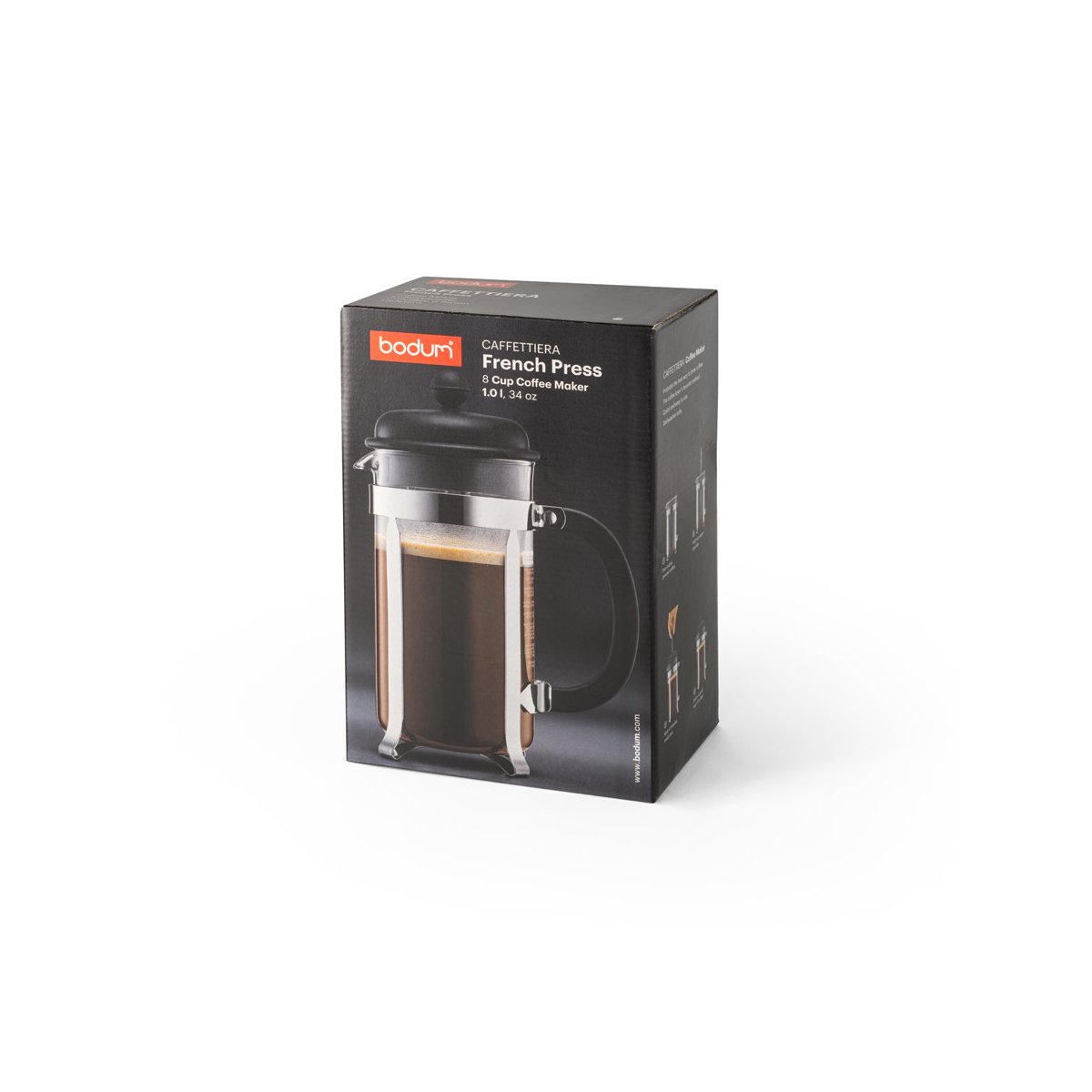 Zaparzacz do kawy typu French Press z pojemnikiem z wysokiej jakości szkła borokrzemowego. Szkło jest odporne na wysokie temperatury i nie zmienia naturalnego smaku kawy. Posiada wielorazowy, wykonany ze stali nierdzewnej tłok i filtr, który wydobywa wszystkie aromaty z ziaren kawy, pozostawiając minimalny osad w filiżance. Rama z chromowanej stali nierdzewnej chroni szklaną karafkę, a plastikowa pokrywa i uchwyt pozwalają na bezpieczne i wygodne użytkowanie. Kawiarka łączy łatwość i szybkość przygotowania z czystością smaku zaparzacza french press. Pojemność do 1 L. Dostarczany w pudełku upominkowym