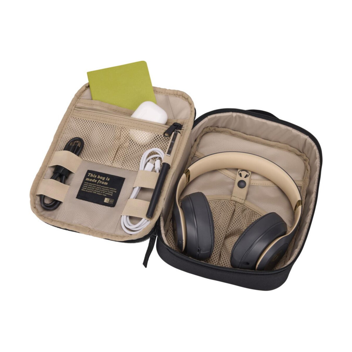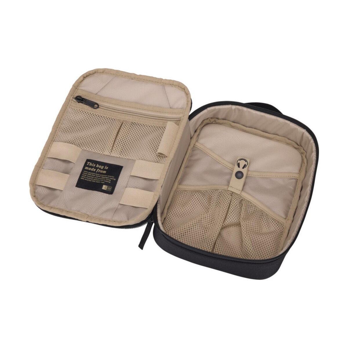 Wewnątrz znajdziesz kieszeń na długopis, kieszeń zamykaną na suwak, sporą kieszeń wsuwaną oraz dedykowane przegródki na większe przedmioty, takie jak słuchawki. Całość wykonana jest w 100 % z poliestru 600D pochodzącego z recyklingu oraz podszewki 150D, co podkreśla troskę o środowisko i wpisuje się w rosnący trend na produkty ekologiczne. Materiał charakteryzuje się wysoką odpornością na przetarcia, więc zawartość pozostaje bezpieczna nawet przy intensywnym użytkowaniu.