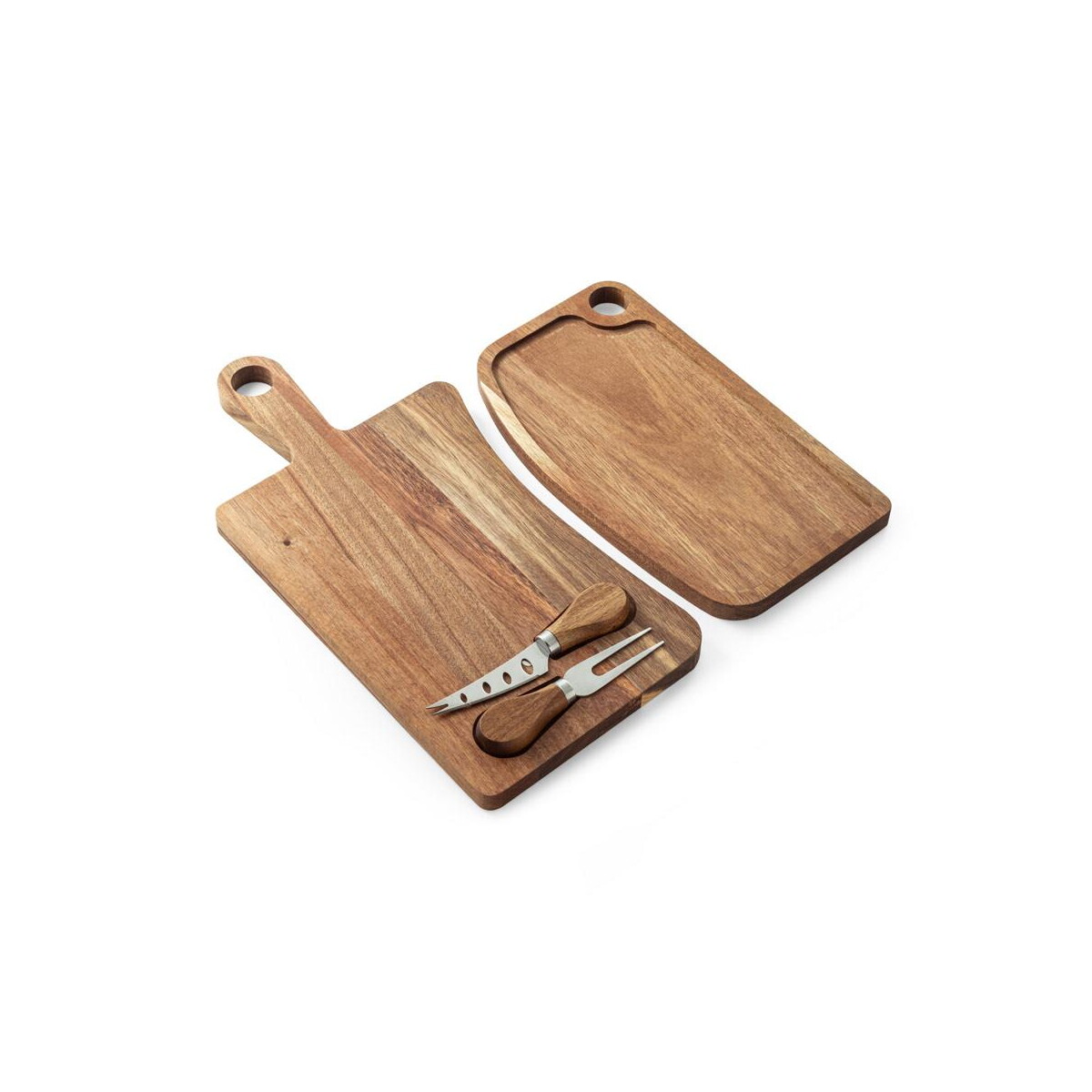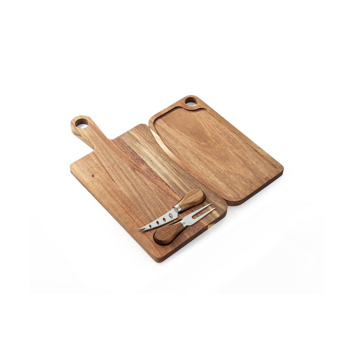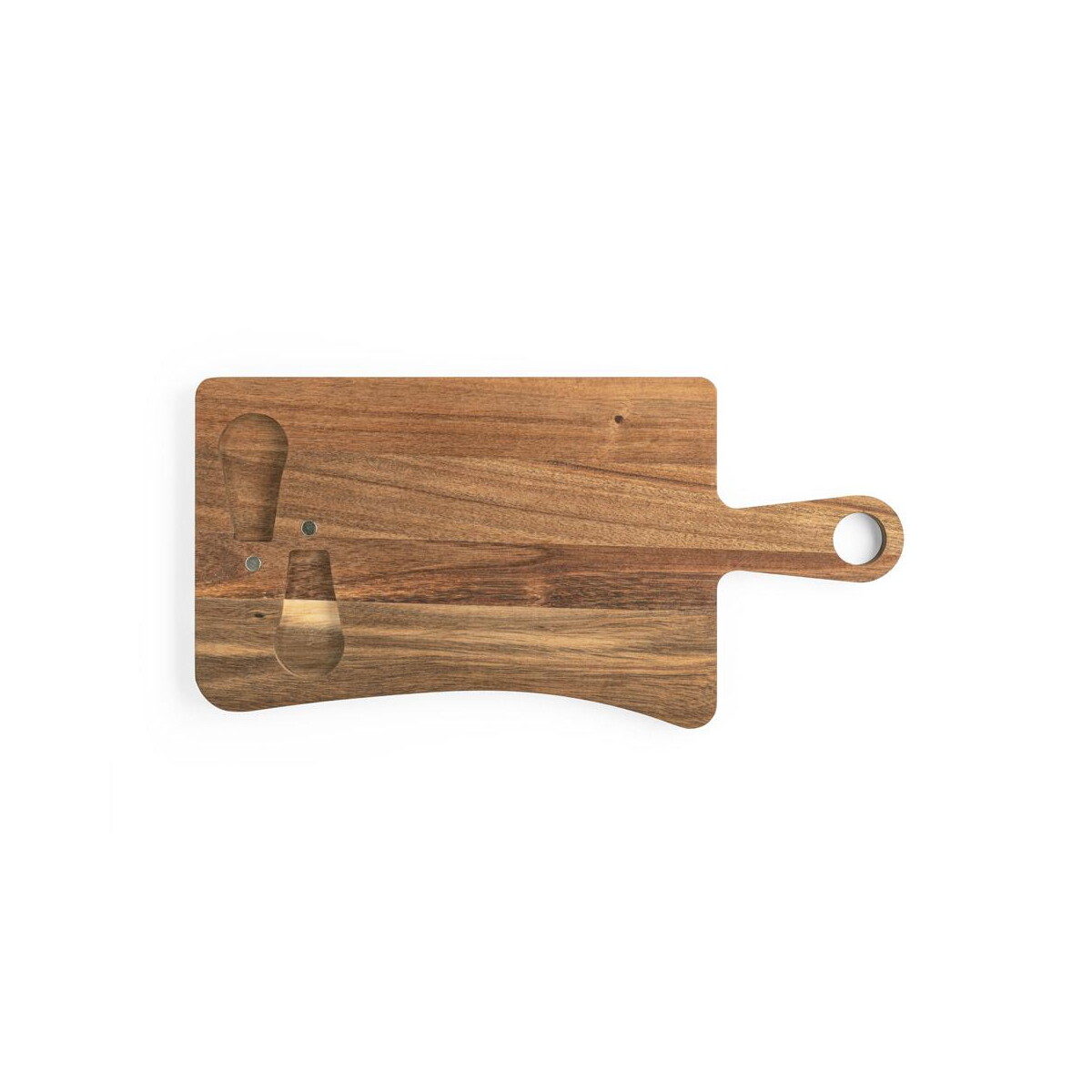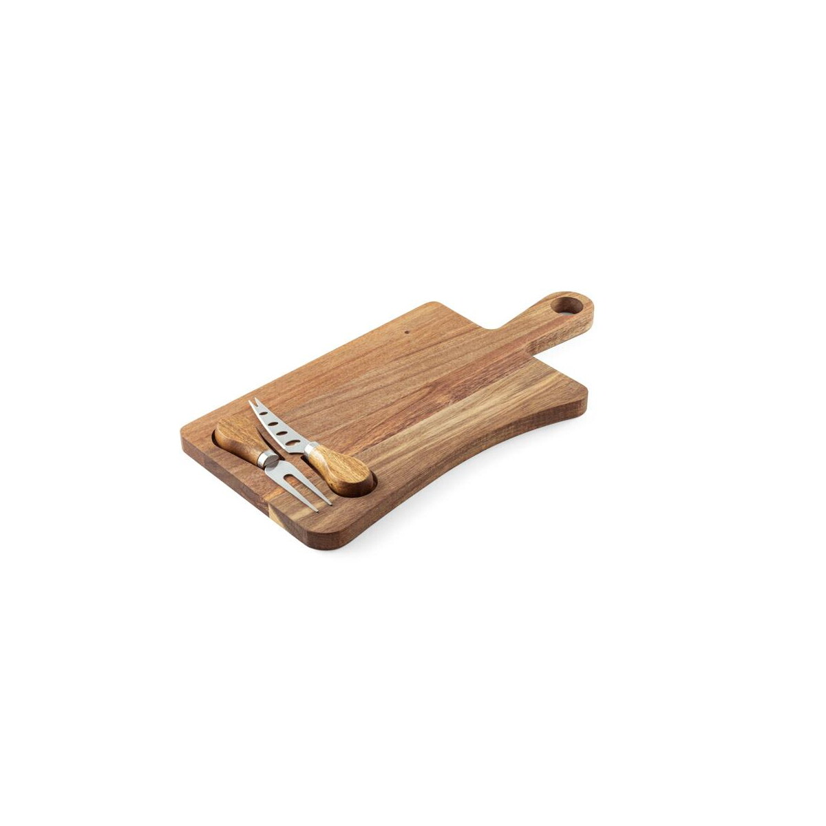 CASSIA. Deska do serów z drewna akacjowego z uchwytem, z materiału z certyfikatem FSC™ i innych kontrolowanych materiałów to perfekcyjny sposób, aby podkreślić charakter Twojej marki podczas eleganckiego spotkania biznesowego czy kameralnej kolacji. Wykonana z drewna akacjowego o unikalnym usłojeniu, wyposażona w praktyczny uchwyt oraz ukryty magnes utrzymujący dołączone nóż i widelec ze stali nierdzewnej, zachwyci zarówno estetów, jak i smakoszy 🧀. Dzięki certyfikacji FSC™ podkreślisz troskę o środowisko, co czyni produkt idealnym wyborem dla firm stawiających na zrównoważony rozwój.