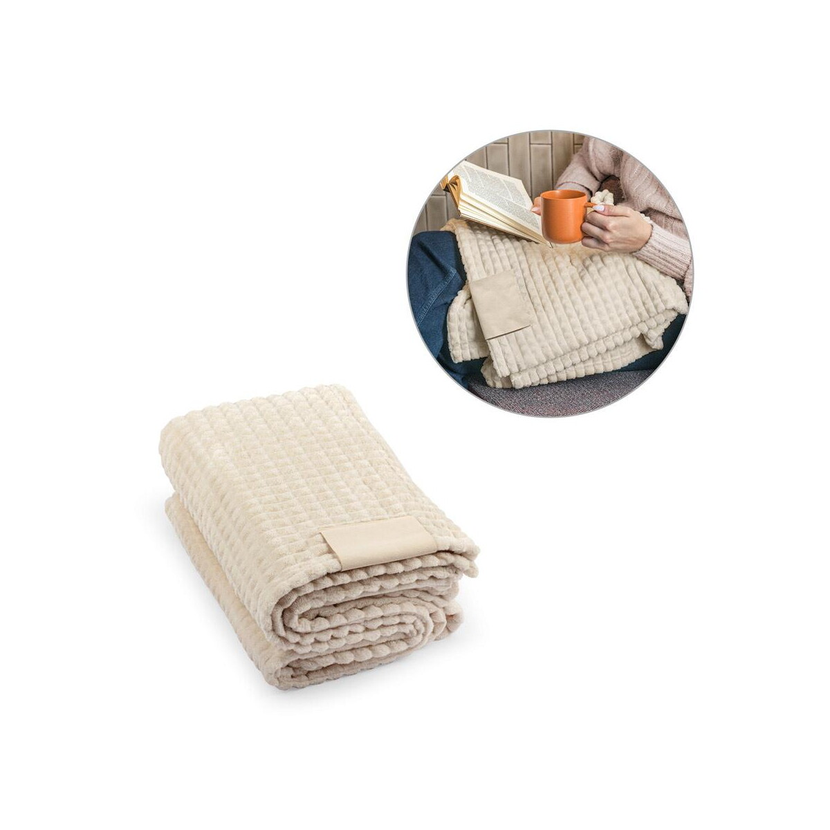 CELINE. Koc z poliestru z recyklingu (100% rPET) z przeszyciami do personalizacji to znakomity kompan chłodniejszych wieczorów, który łączy troskę o środowisko z niebanalnym stylem 😊. Uszyty z 100% rPET, o wymiarach 1600 x 1200 mm i wadze zaledwie 600 g, zachwyca miękkością oraz subtelnym, beżowym odcieniem wpisującym się w nowoczesne wnętrza. Dzięki specjalnym przeszyciom, koc stworzono z myślą o wyrazistej personalizacji – Twoje firmowe logo czy dowolny nadruk będą prezentować się elegancko i trwałe, tworząc niepowtarzalny akcent.