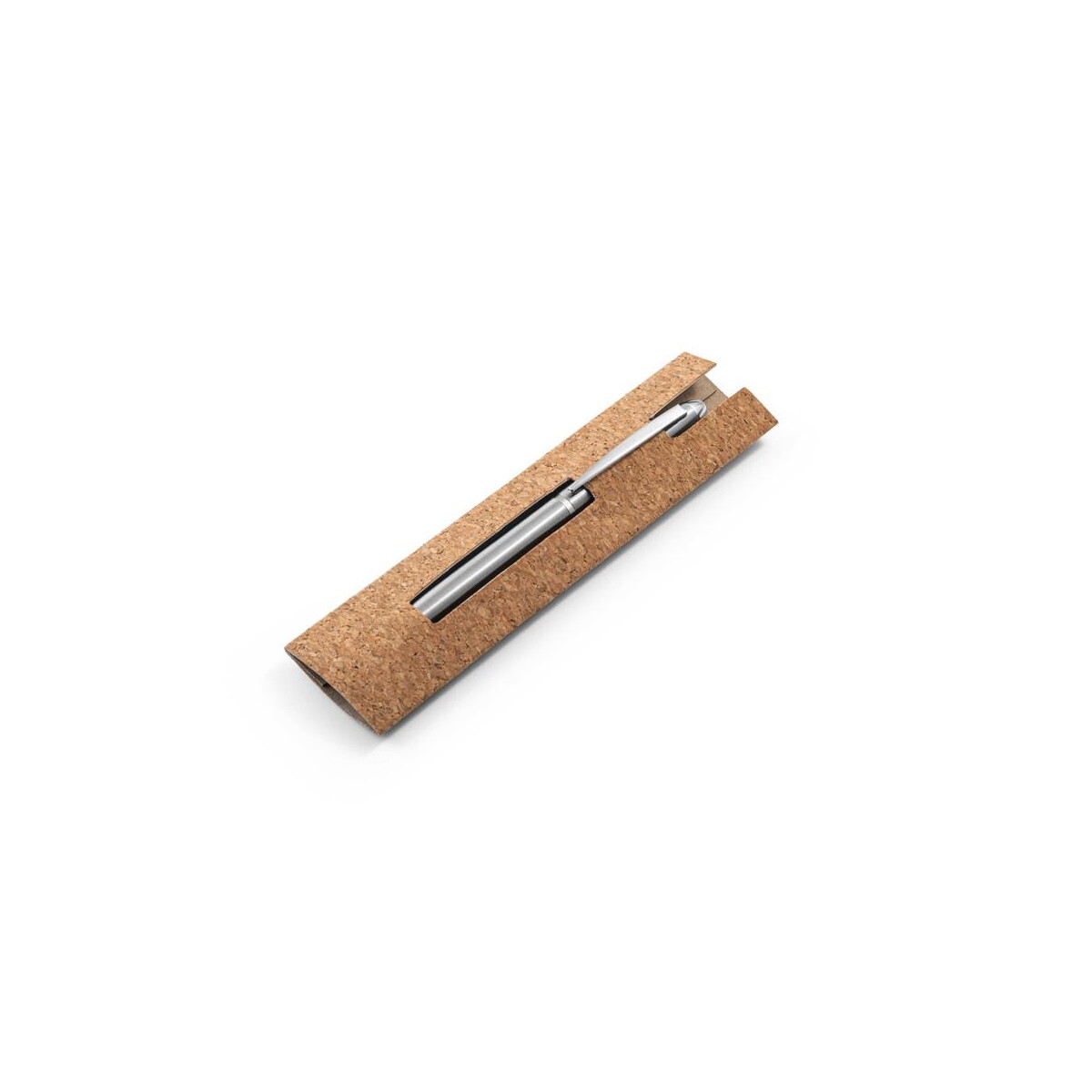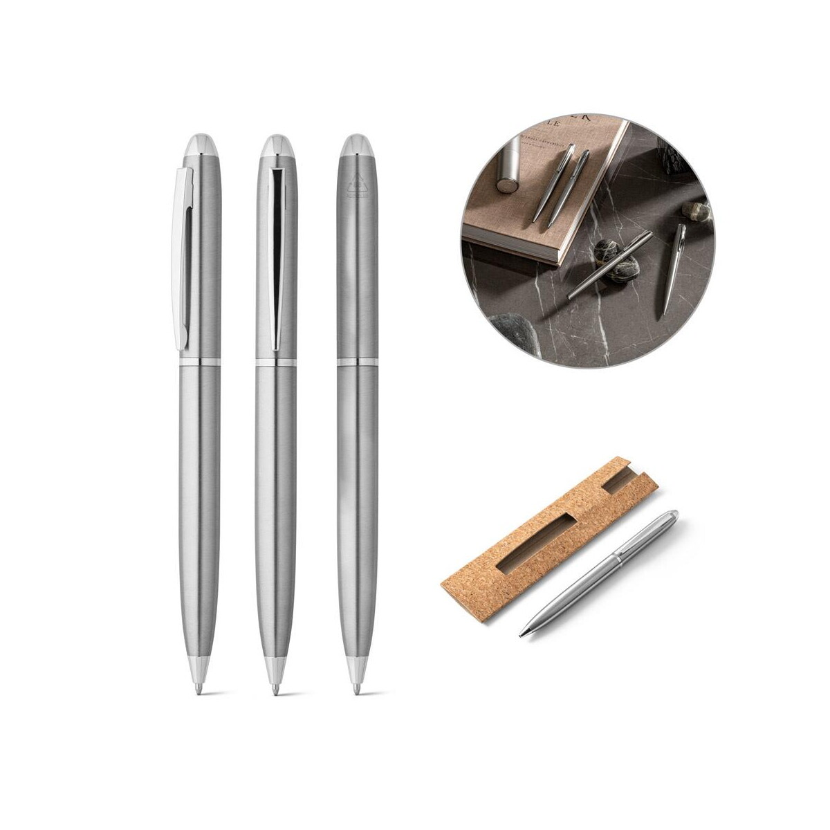 CHRIS. Długopis z korpusem ze stali nierdzewnej (53% rSS) i klipem to ekskluzywny gadżet, który zachwyci każdego miłośnika eleganckich akcesoriów piśmienniczych. Wykonany z recyklingowanej stali nierdzewnej o zawartości 53% rSS, ten model łączy nowoczesny design z dbałością o środowisko. Smukły korpus o średnicy 11 mm i długości 137 mm doskonale leży w dłoni, a jego wyważona waga 33 g gwarantuje komfort nawet podczas długiego pisania. Subtelny srebrny odcień w zestawieniu z naturalnym etui z korka 155 × 40 mm tworzy spójną, ekologiczno-biznesową całość.