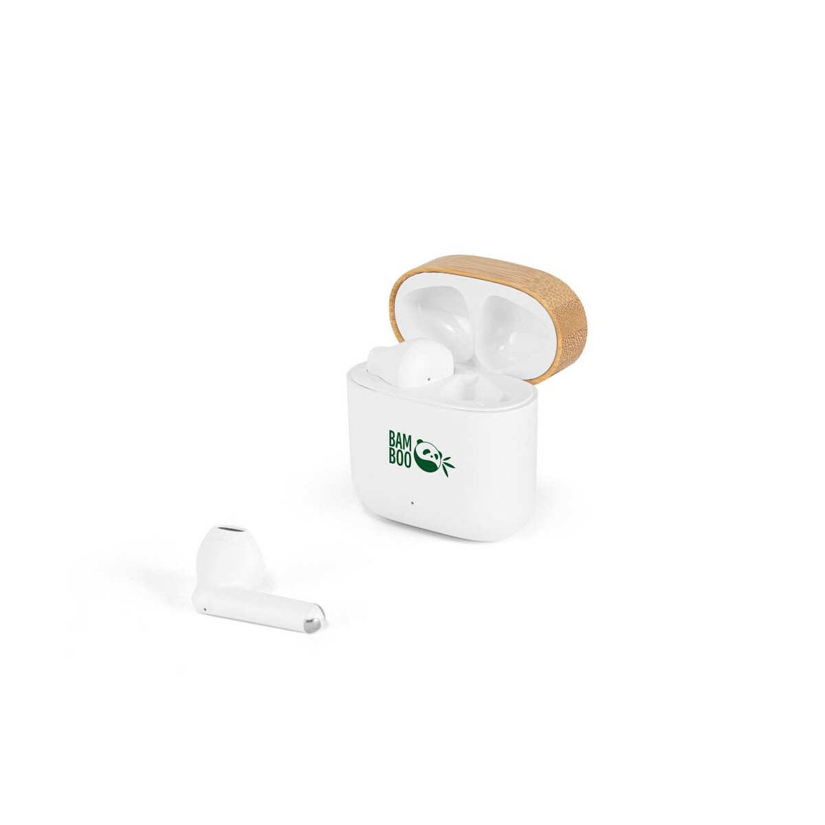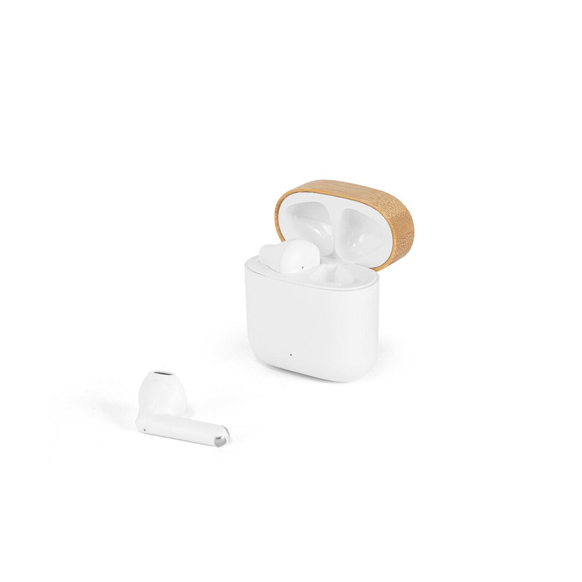 COBAIN. Słuchawki bezprzewodowe z 5-godzinnym czasem pracy wykonane w przetworzonego ABS (100% rABS) i bambusa to perfekcyjne połączenie nowoczesnej technologii oraz ekologicznej świadomości. Te douszne słuchawki w eleganckim, białym kolorze ważą jedynie 49 g, a ich kompaktowe wymiary 48 x 26 x 47 mm sprawiają, że mieszczą się w każdej kieszeni czy torebce. Zestaw wyposażono w etui ładujące z bambusa o pojemności 300 mAh, które potrafi trzykrotnie doładować słuchawki, gwarantując łącznie nawet 15 godzin muzyki lub rozmów – wszystko dzięki stabilnemu połączeniu Bluetooth 5.3 🎶.