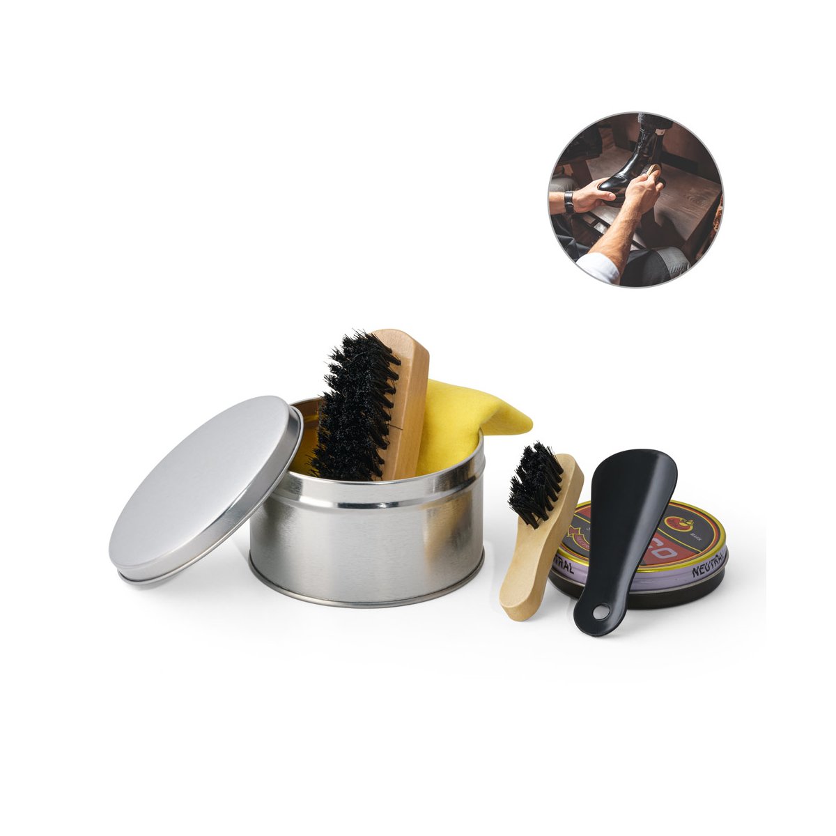 Zestaw do czyszczenia butów składający się z 6 elementów: pudełka, łyżki do butów, 2 szczotek, ściereczek i pasty. Idealny zestaw, aby Twoje buty były zawsze czyste i lśniące. Dostępny w metalowym pudełku o okrągłym kształcie