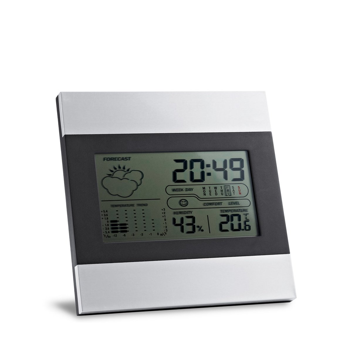 Zestaw biurkowy wykonany z aluminium. Ekran LCD. Z kalendarzem, alarmem i informacjami o pogodzie oraz jej prognozą. Dołączone 2 baterie AAA