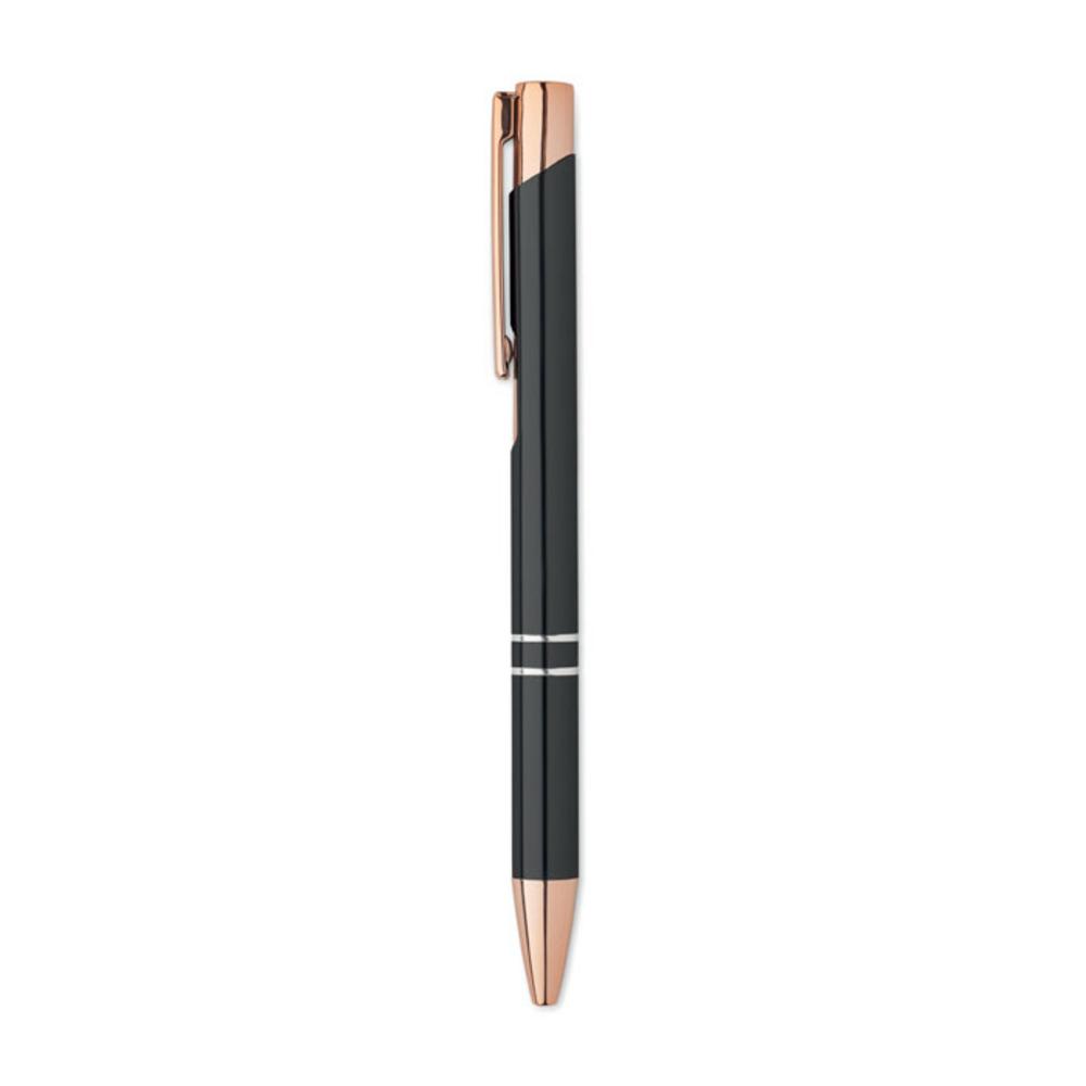 Długopis aluminiowy z rec. BERN ROSE to nowoczesny, a zarazem przyjazny środowisku gadżet, który świetnie sprawdzi się jako elegancki nośnik Twojego logo. Wykonany z aluminium pochodzącego z recyklingu, z mechanizmem przyciskowym i niebieskim wkładem, łączy w sobie ekologię i prestiż, będąc perfekcyjnym wyborem dla Twojej firmy 😊. Jego uniwersalny, metaliczny design w kolorach beżowym, białym, srebrnym lub czarnym podkreśla profesjonalizm marki, a smukła forma ( ø1×13,5 cm, waga 0,019 kg) sprawia, że pewnie leży w dłoni i mieści się w każdym etui.