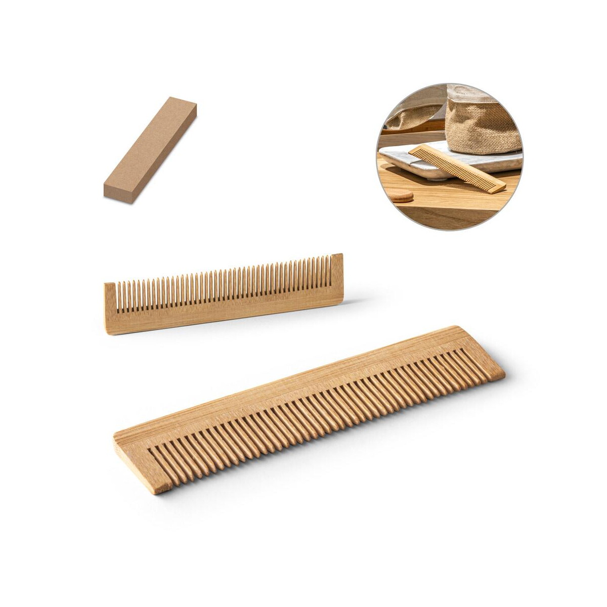 Produkt dostarczany jest w eleganckim, kraftowym pudełku o wymiarach 150 × 35 × 10 mm, co dodatkowo podnosi jego wartość upominkową 🌿. Naturalny materiał sprawia, że każdy egzemplarz posiada unikalny odcień i usłojenie, a ewentualny nadruk z logo nabiera wyjątkowego charakteru. Dzięki temu ENOS. Grzebień bambusowy staje się nie tylko praktycznym akcesorium, lecz także eleganckim nośnikiem wizerunku marki.