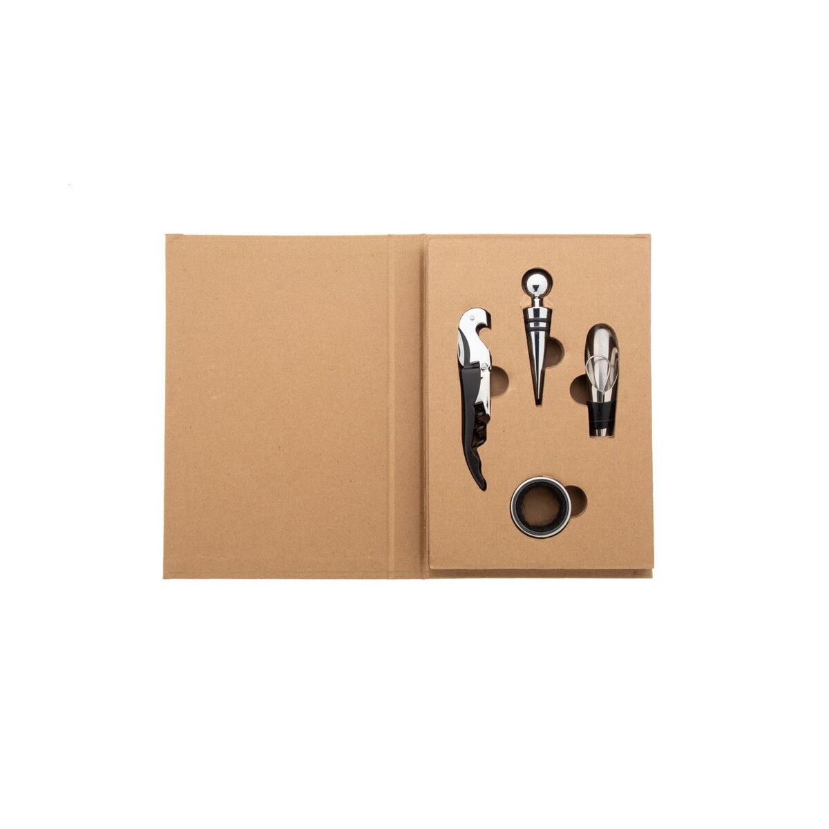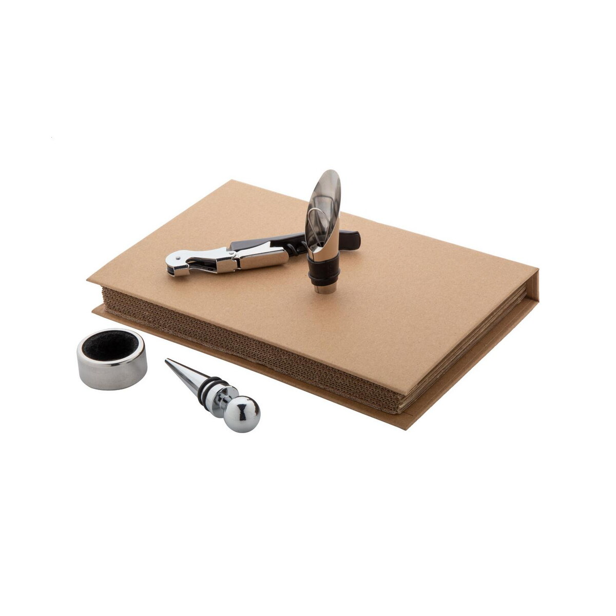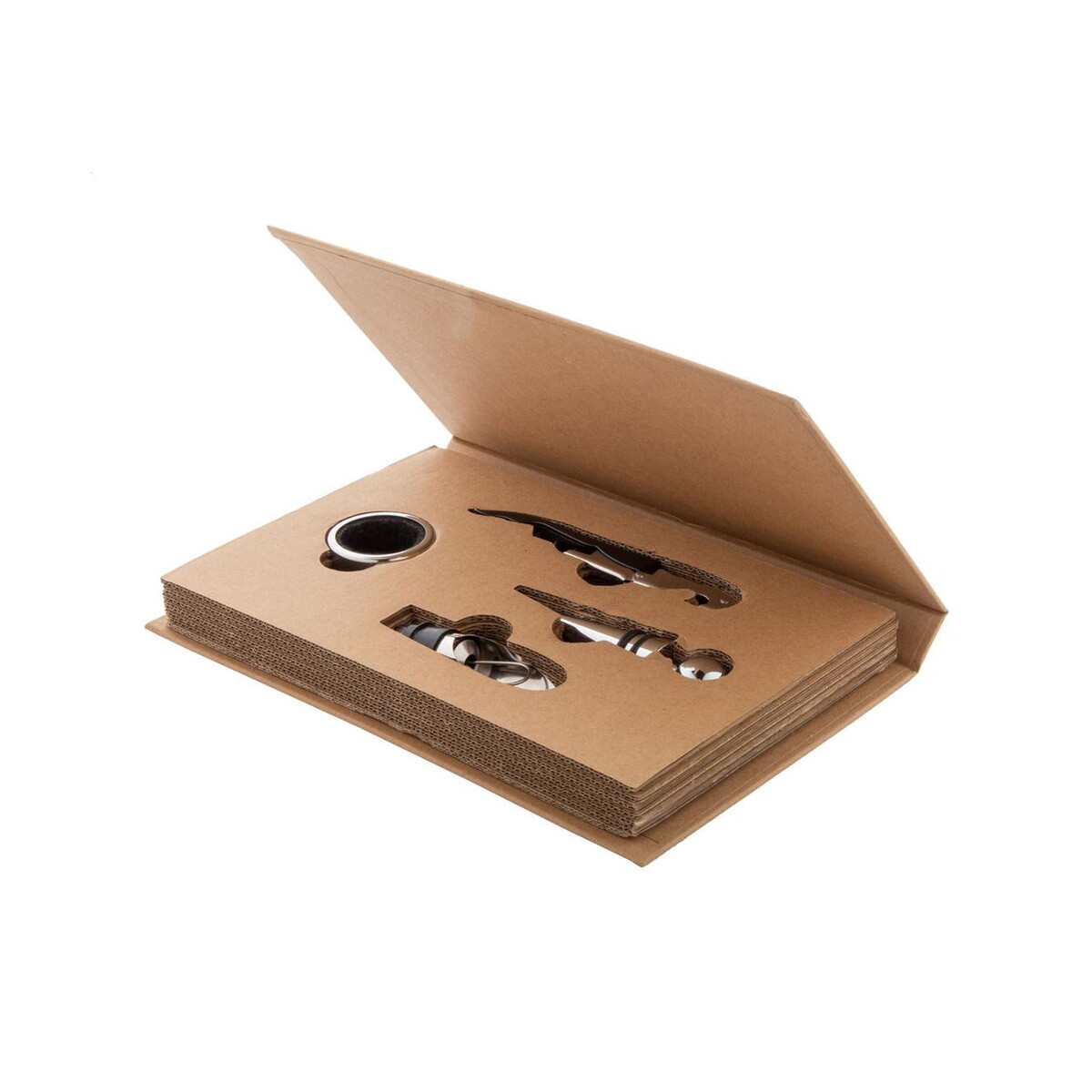 Fiano zestaw do wina to gadżet, który błyskawicznie podniesie prestiż każdego spotkania biznesowego i degustacji. Ukryty w eleganckim pudełku w kształcie książki z papieru kraft z recyklingu (wymiary 155×226×26 mm, waga zaledwie 335 g) stanowi zarówno praktyczne narzędzie, jak i efektowną dekorację. Wewnątrz znajdziesz cztery precyzyjnie wykonane akcesoria ze stali nierdzewnej: korkociąg, ociekacz, lejek oraz zatyczkę, które razem tworzą kompletny zestaw do serwowania wina. Zewnętrzna powierzchnia opakowania oferuje gładką przestrzeń na logo lub oryginalny nadruk, dzięki czemu ten produkt staje się nośnikiem Twojej marki 🙂.