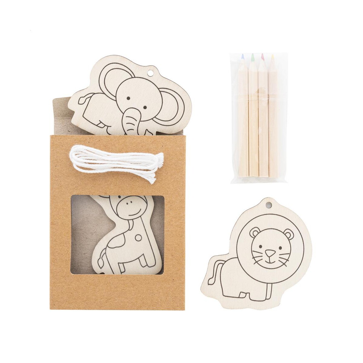 Handala zestaw do kolorowania to znakomite połączenie kreatywnej zabawy i ekologicznej troski o planetę. W kompaktowym pudełku z papieru kraft kryją się 3 urocze, drewniane figurki zwierząt, 4 drewniane kredki oraz sznurki, które pozwolą zamienić pokolorowane dzieła w dekoracje do pokoju lub świąteczne zawieszki. Dzięki możliwości umieszczenia Twojego logo, ten niepozorny, a zarazem efektowny gadżet staje się doskonałym nośnikiem przekazu reklamowego 😊. Wymiary: 94×122×14 mm, waga: 35 g, materiał: drewno, kolor: naturalny – te atuty sprawiają, że zestaw jest lekki, poręczny i w pełni biodegradowalny.