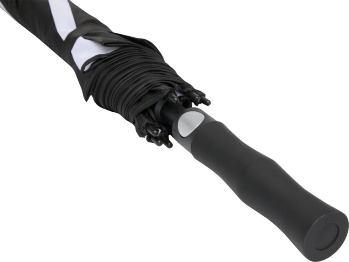 Dzięki kontrastującym klinom czaszy Jeff 30-calowy wiatroodporny parasol golfowy staje się doskonałym nośnikiem Twojego brandu. Szeroka powierzchnia umożliwia wyrazisty nadruk, a widoczne z daleka logo buduje rozpoznawalność marki przy każdej ulewie czy ostrym słońcu. To rewelacyjny gadżet reklamowy dla branży sportowej, turystycznej, motoryzacyjnej, budowlanej, a nawet sektora finansowego sponsorującego turnieje golfowe. Parasole golfowe z logo sprawdzą się również na targach i konferencjach branży IT, kiedy trzeba przeprowadzić VIP-ów między halami w wielkim stylu.