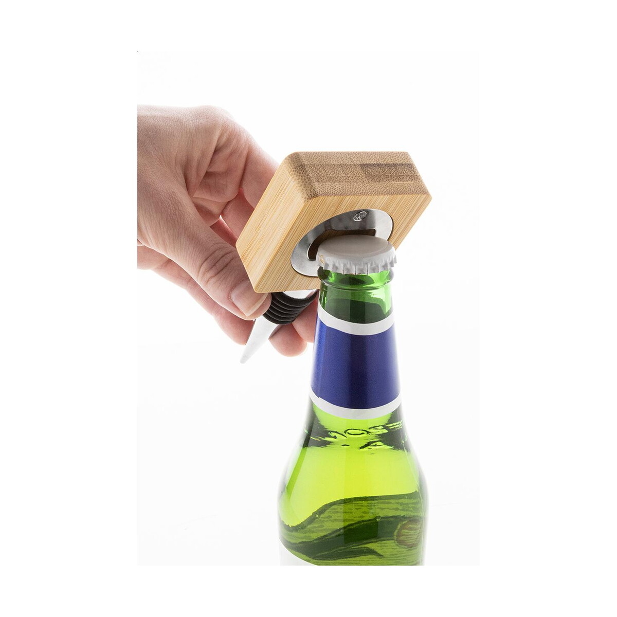 Model wyróżniają wymiary: 55×115×20 mm oraz niewielka waga: 55 g, dzięki czemu pewnie leży w dłoni i nie obciąża kieszeni sommeliera. Solidny materiał: Metal + Bambus gwarantuje trwałość, a naturalny kolor pozwala dopasować się do każdego wystroju stołu. Na powierzchni bambusa z łatwością umieścisz widoczne logo lub elegancki nadruk, co przemieni prosty przedmiot w wyjątkowy nośnik przekazu.