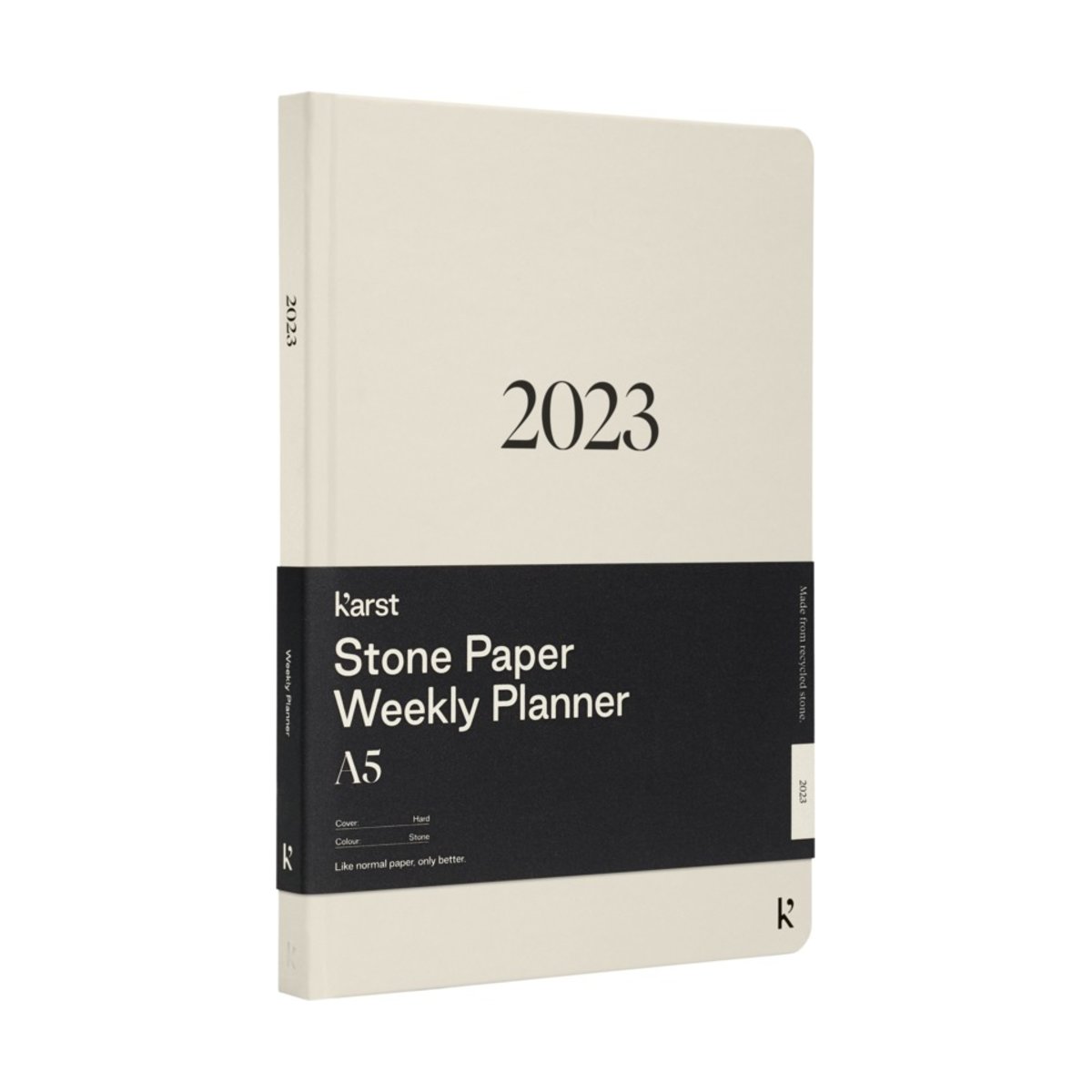Karst® planer z podziałem na tygodnie w formacie A5, twarda oprawa to innowacyjne narzędzie, które łączy w sobie funkcjonalność klasycznego terminarza z inspirującym przewodnikiem rozwoju osobistego. Wykonany z opatentowanego papieru z kamienia, oferuje aż 162 gładkie strony, które są nie tylko wodoodporne, ale także wyjątkowo przyjemne w dotyku. Dzięki eleganckiej, twardej oprawie w kolorze głębokiego granatu i idealnemu formatowi A5, planer zmieści się w każdej torbie, pozostając odpornym na codzienne wyzwania biurowe i podróżnicze 🙂.