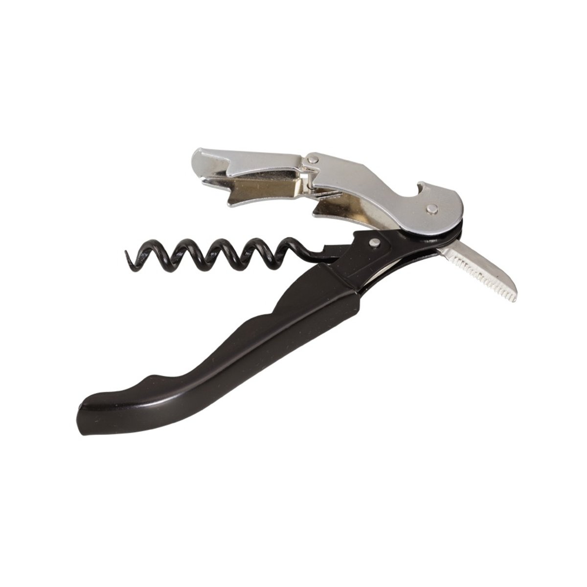 Dwustopniowy system dźwigni gwarantuje płynne i bezwysiłkowe usuwanie korka, a zintegrowany nożyk sprawia, że odcięcie folii jest szybkie i estetyczne. Kompaktowe wymiary i lekka, lecz wytrzymała konstrukcja pozwalają schować otwieracz do kieszeni kelnera, torby piknikowej czy zestawu barmańskiego. Czarny kolor nadaje mu uniwersalnej elegancji, dzięki czemu pasuje zarówno do klasycznych, jak i nowoczesnych aranżacji stołu.