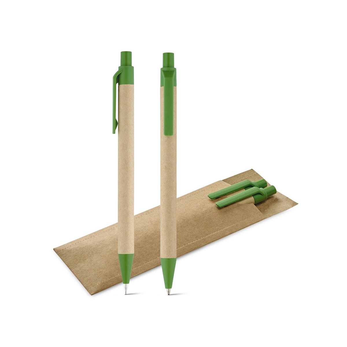 Zestaw: długopis i ołówek z papieru kraftowego. Oba produkty z klipsem. Ołówek automatyczny ma 0,5 mm, a długopis posiada niebieski wkład. Przyjazny dla środowiska długopis. Dostarczany w kartonowym etui