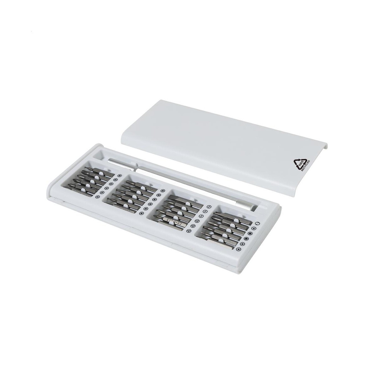 Manybit zestaw narzędzi / bity RABS to przemyślany, kompaktowy i niezwykle praktyczny gadżet, który sprawdzi się zarówno w biurze, jak i w terenie. W eleganckim etui wykonanym z przyjaznego środowisku ABS z recyklingu kryją się 24 bity oraz ergonomiczna rękojeść z magnetycznym uchwytem, umożliwiająca błyskawiczną i bezpieczną wymianę końcówek. Dzięki wymiarom 158×67×16 mm i wadze zaledwie 156 g zestaw łatwo zmieści się w kieszeni torby laptopowej czy szufladzie biurka, a dostępność w kolorze białym lub czarnym pozwala dopasować go do identyfikacji wizualnej Twojej marki 😊.