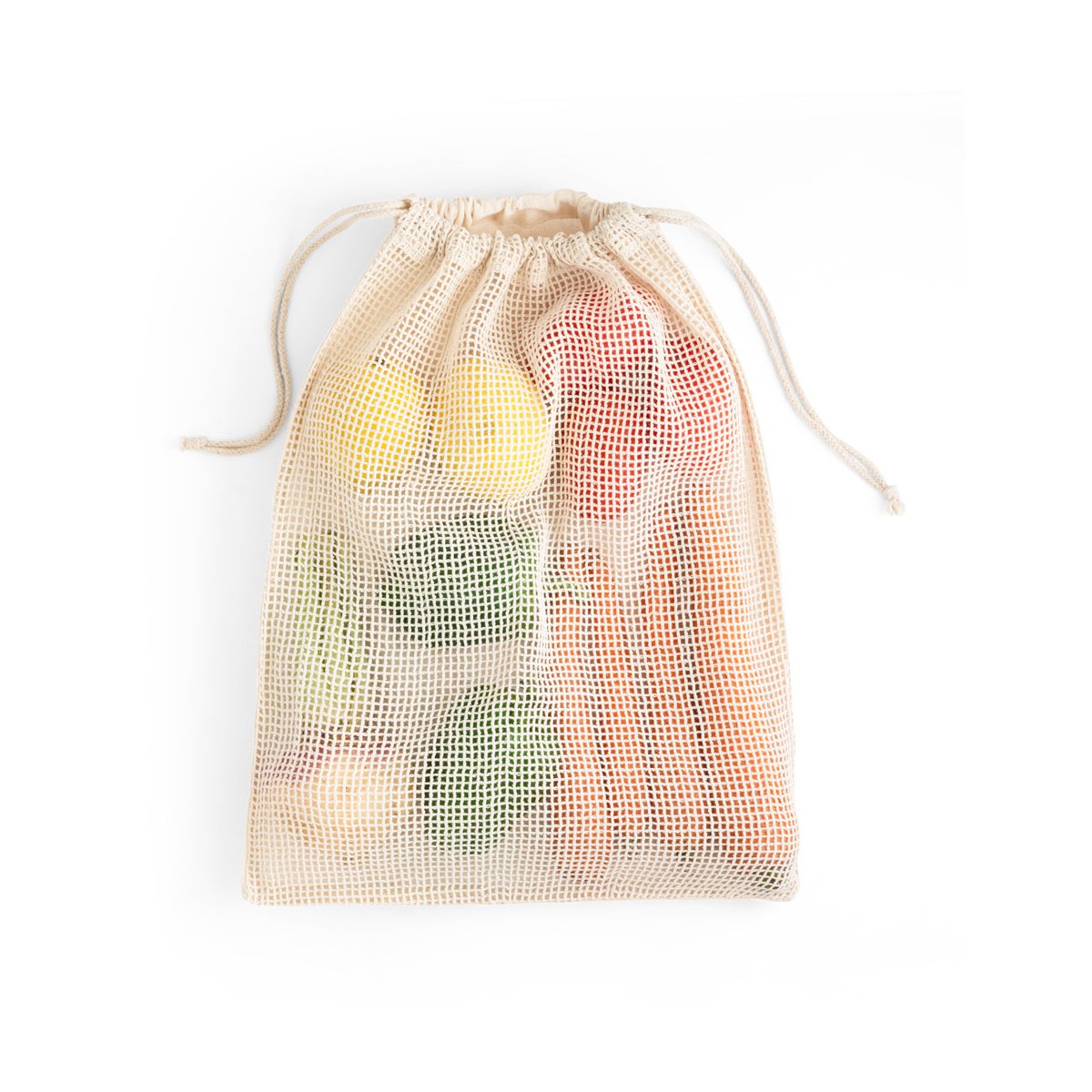 Torba ze 100% bawełny (120 g/m²) z siateczką ze 100% bawełny z przodu (100 g/m²). Z bawełnianym sznureczkiem do zamknięcia. Idealna do przenoszenia żywności