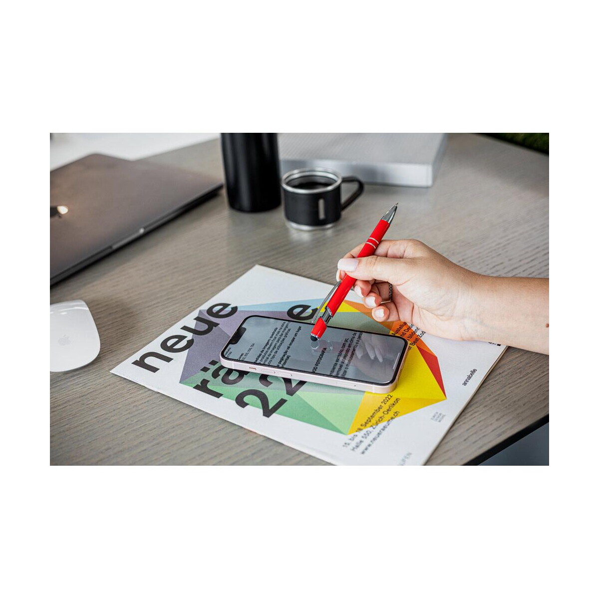 Dzięki górnej końcówce dotykowej pióro działa nie tylko na papierze – bezproblemowo obsłużysz nim ekran smartfona czy tabletu, minimalizując smugi i odciski palców. Wbudowany niebieski tusz gwarantuje płynne, równomierne linie, co czyni pisanie prawdziwą przyjemnością. NEIL. Pióro kulkowe z korpusem z aluminium pochodzącego z recyklingu (100% rAL) i końcówką dotykową jest wręcz doskonałe do znakowania – laserowy lub tampodrukowy nadruk podkreśli Twoje logo i pozwoli wyróżnić się w tłumie.