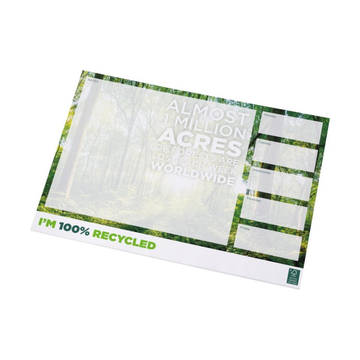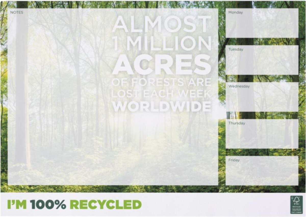 Notatnik Desk-Mate® w formacie A3 z materiałów z recyklingu to ekologiczny gadżet stworzony z myślą o firmach, które chcą wyróżnić się przyjaznym dla planety wizerunkiem 🙂. W standardzie zawiera 50 arkuszy papieru pochodzącego z odzysku o gramaturze 80 g/m², a każda kartka może zostać ozdobiona pełnokolorowym nadrukiem – od subtelnego hasła po rozbudowaną grafikę produktową. Solidny karton z recyklingu 280 g/m² wzmacnia blok, nadając mu trwałość podczas intensywnego użytkowania w biurze, na targach czy w terenie.