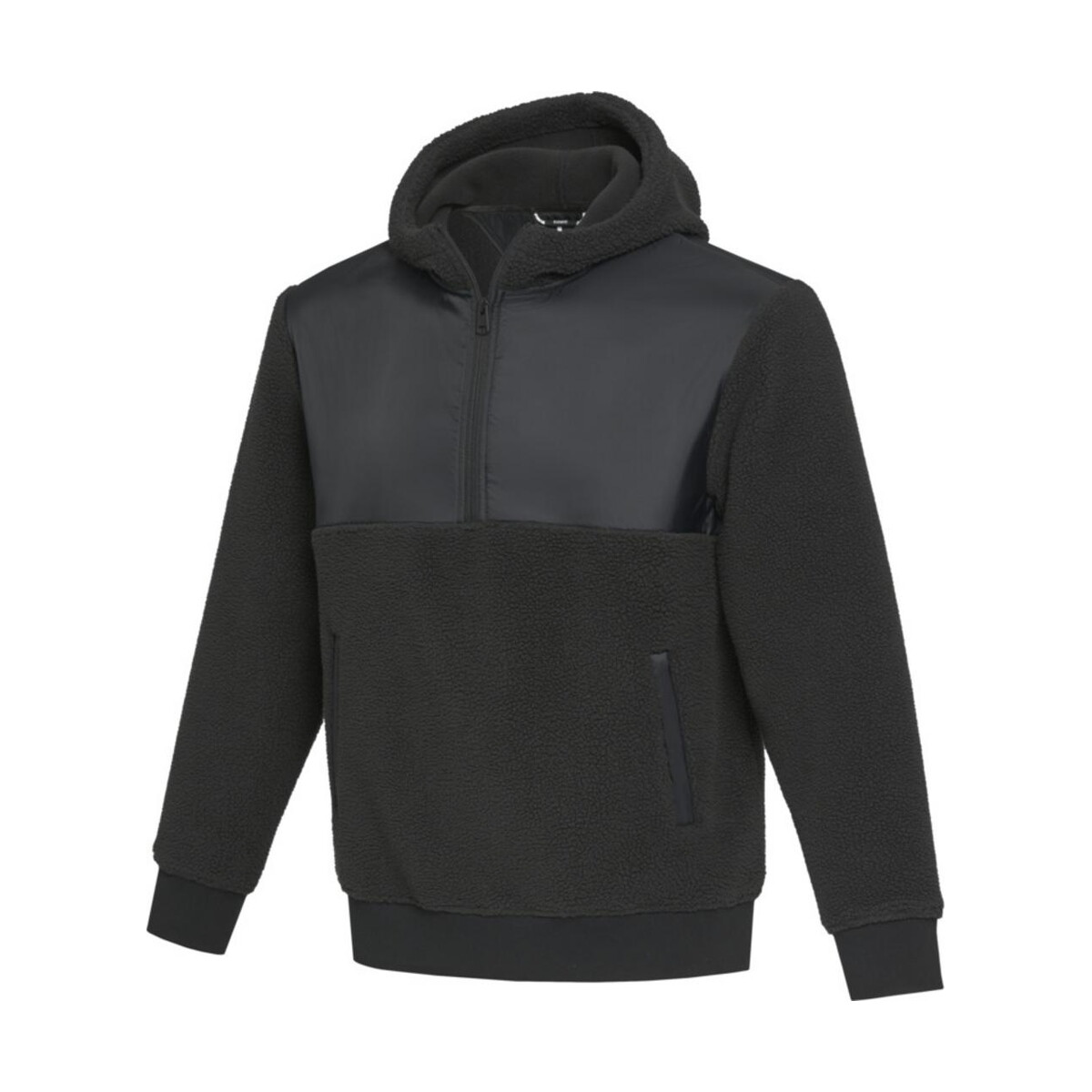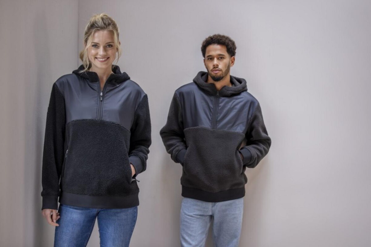Najważniejsze cechy produktu: materiał Sherpa Recycled Poliester 370 g/m², waga 850 g, certyfikat GRS, zamek 1/4 z osłoną podbródka, kaptur z regulacją, styl oversize i minimalistyczne wykończenia kontrastowym nylonem. Wybierz ten produkt reklamowy i pokaż, że troska o planetę może iść w parze z nowoczesną estetyką oraz skuteczną promocją marki.