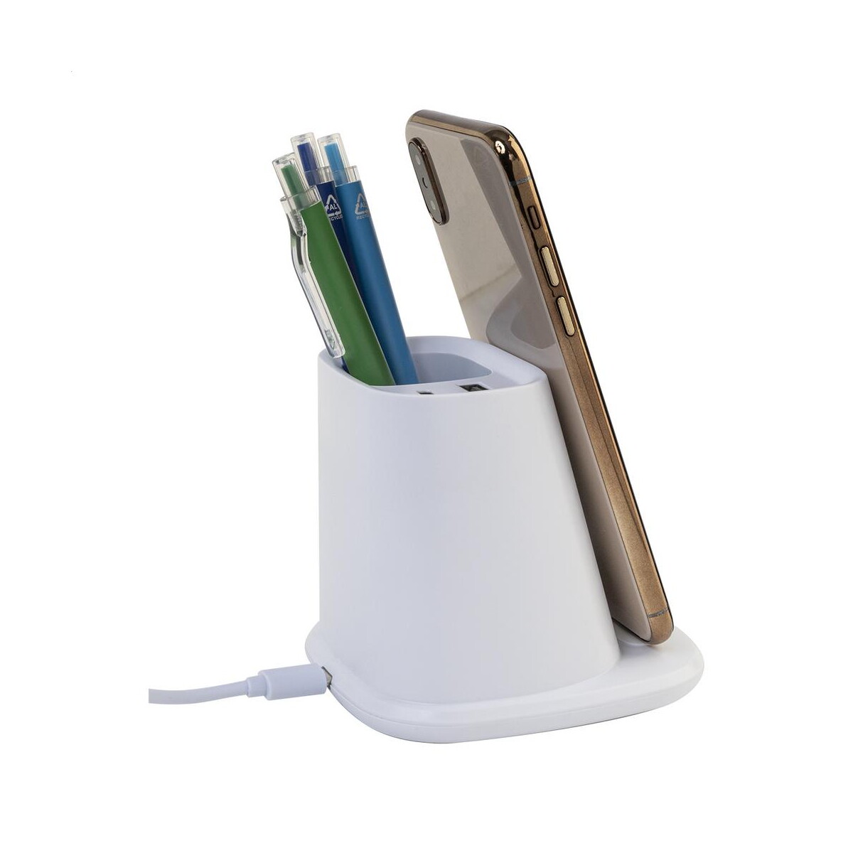 Powerdesk wielofunkcyjny uchwyt na długopisy RABS to prawdziwe centrum dowodzenia na Twoim biurku. W kompaktowej bryle 88×100×88 mm kryje się pojemnik na przybory, praktyczny uchwyt na smartfon oraz wbudowana szybka ładowarka bezprzewodowa o mocy 10 W. Do dyspozycji masz także 1 port USB i 1 port USB-C, dzięki czemu jednocześnie naładujesz kilka urządzeń. Lekka konstrukcja z recyklingowanego ABS waży zaledwie 216 g, więc łatwo przeniesiesz ją z biura do domu. Nowoczesny biały kolor stanowi neutralne tło, na którym pięknie zaprezentuje się Twoje logo 🙂