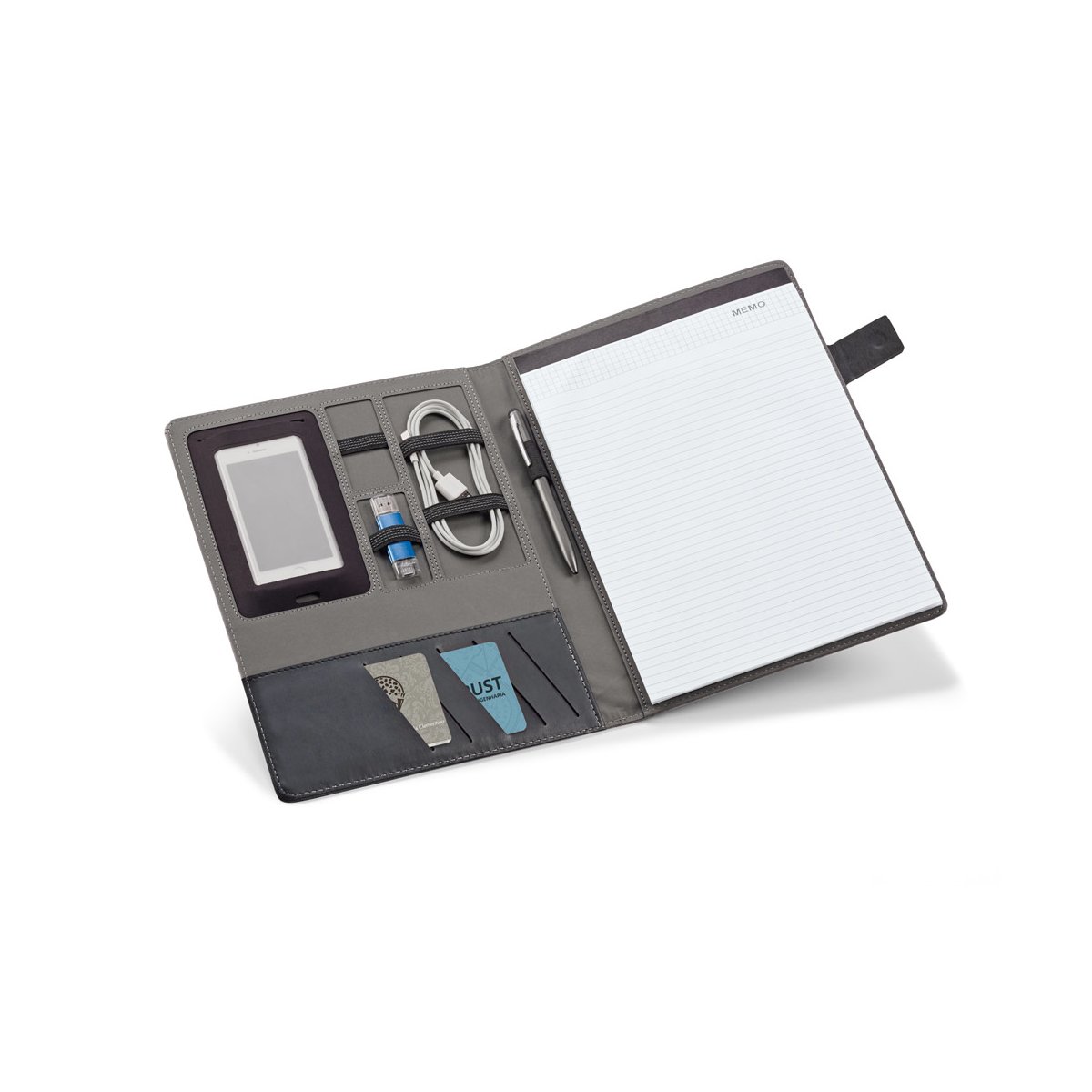 Teczka A4 wykonana z imitacji lnu i i PU. Posiada magnetyczne zamknięcie z płytką z możliwością personalizacji, notes z 20 kartkami w linie, uchwyt na długopis (nie jest dołączony), kieszeń na smartfona i uchwyty na kable lub inne akcesoria (nie dołączone)