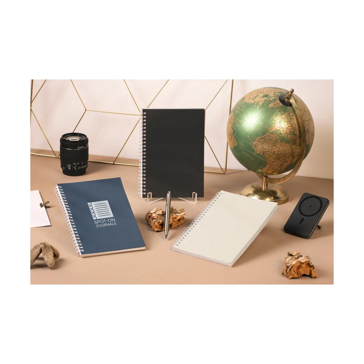 SCHILLER. Notatnik A5 z elastyczną okładką to ekologiczny gadżet, który od pierwszego spojrzenia zachwyca subtelną paletą kolorów – jasnoszarym, czerwonym, granatowym lub czarnym. Wykonany w 100% z papieru pochodzącego z recyklingu, jest wyśmienitym nośnikiem wartości prośrodowiskowych i świetnie sprawdzi się jako reklamowy upominek ♻️. Dzięki elastycznym pierścieniom PE notatnik jest wyjątkowo plastyczny i przyjemnie miękki, a kwadratowe rogi podkreślają nowoczesny charakter. To produkt wprost stworzony dla Twojej firmy, jeśli chcesz pokazać, że troska o planetę idzie w parze z funkcjonalnością.
