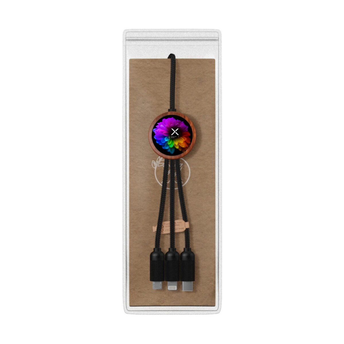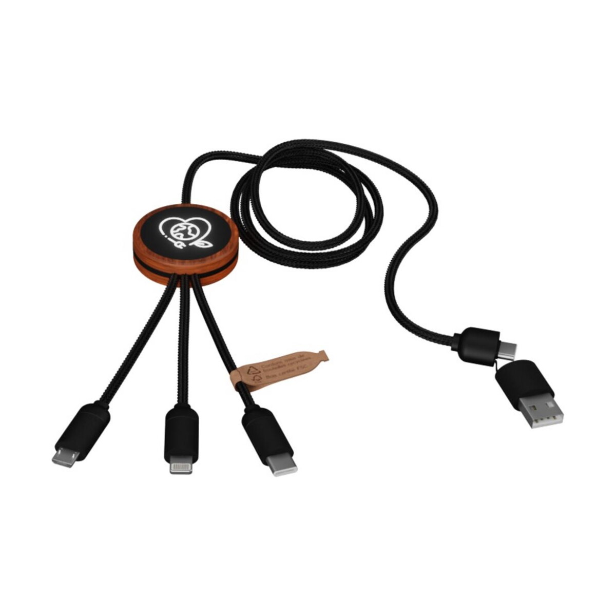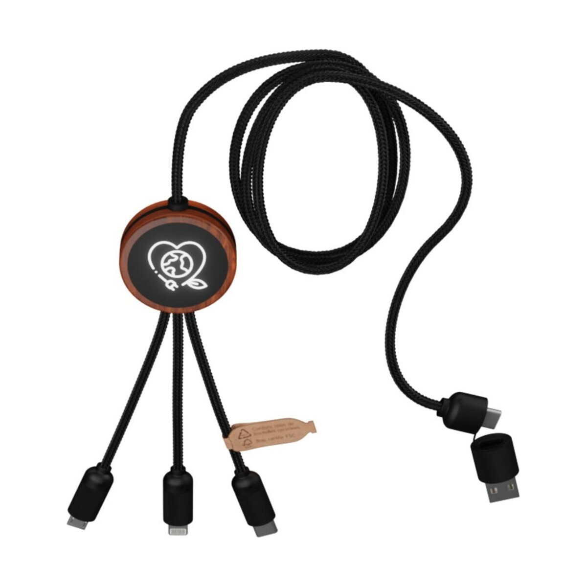 SCX.design C37 kabel do ładowania z podświetlanym logo 5-w-1 rPET i z okrągłą drewnianą obudową 40W to prawdziwie wszechstronny gadżet, który łączy siłę aż pięciu złączy w jednym, oferując moc do 40 W i długość 1 m. W kompaktowej konstrukcji (100 × 1,1 × Ø 3 cm, 40 g) kryją się złącza USB-C, micro USB, Lightning oraz podwójne USB, dlatego naładujesz praktycznie każde urządzenie 🔌. Okrągła obudowa z bambusa w połączeniu z tworzywem ABS i PET z recyklingu tworzy ekologiczny charakter, a dwustronne podświetlane logo przyciąga wzrok w dzień i po zmroku 😊.