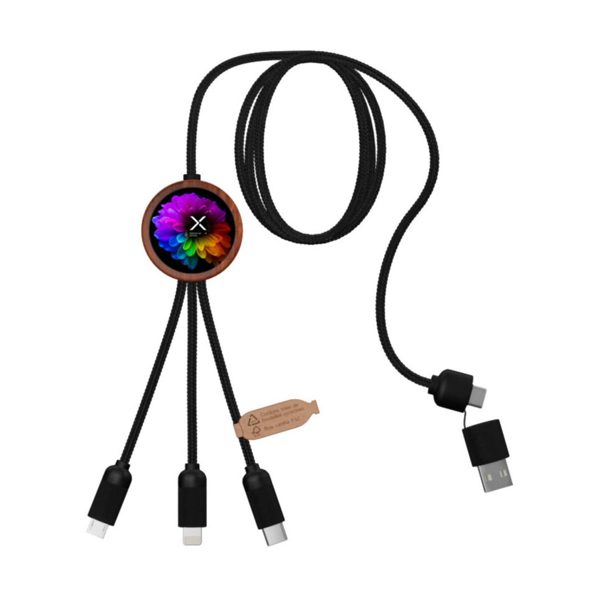 SCX.design C37 kabel do ładowania z podświetlanym logo 5-w-1 rPET i z okrągłą drewnianą obudową 40W