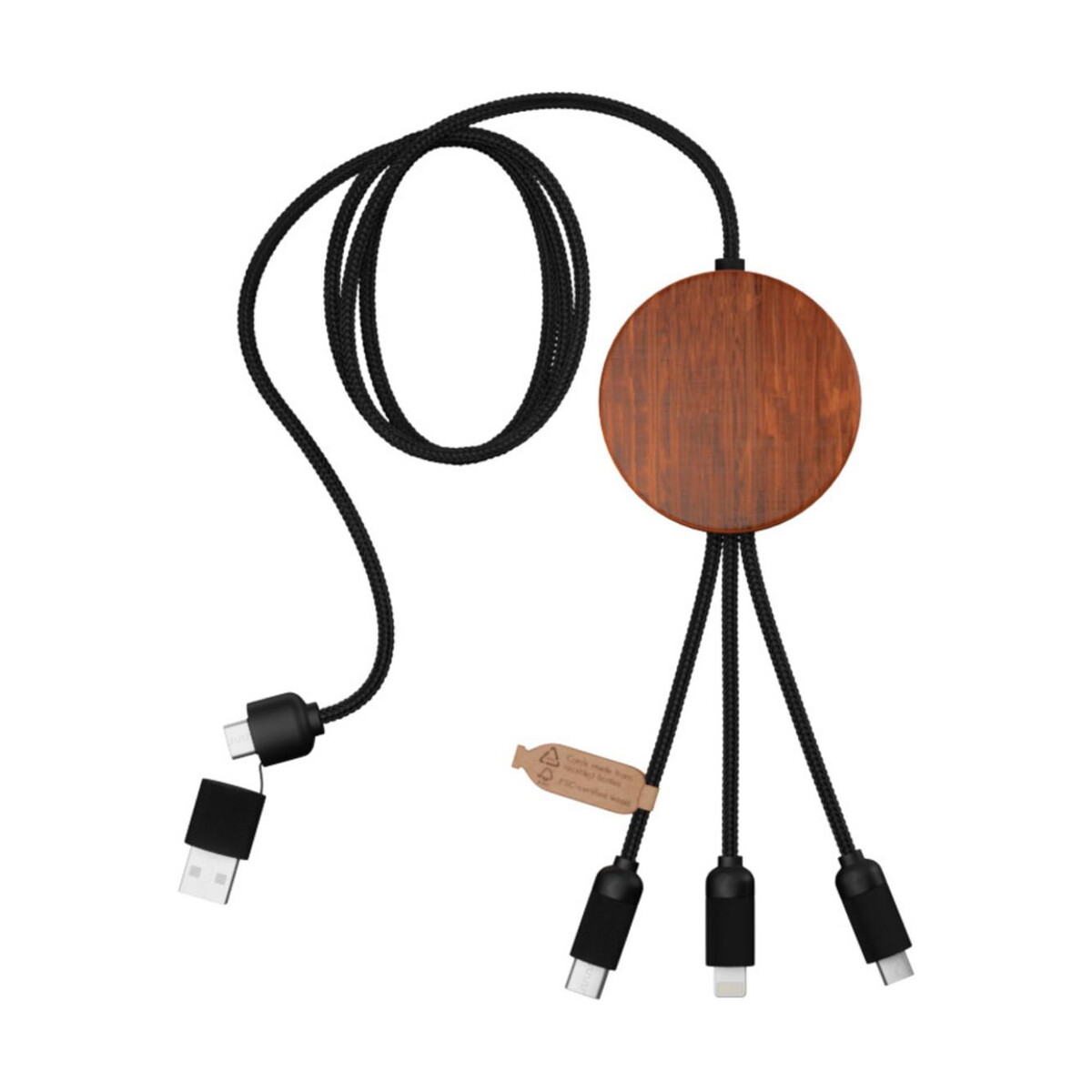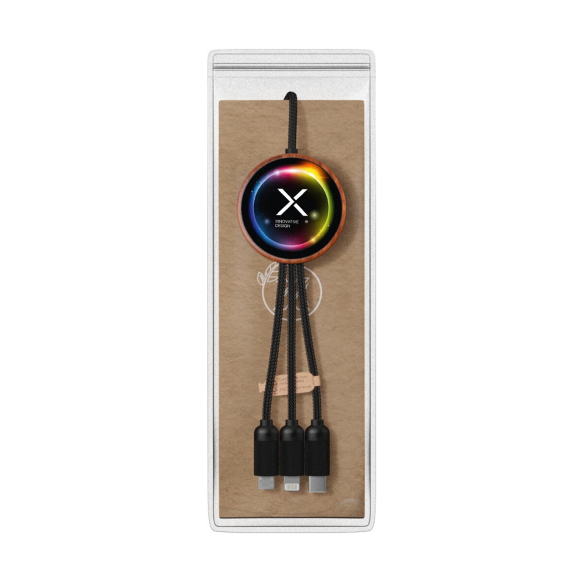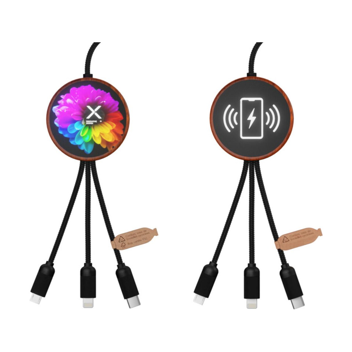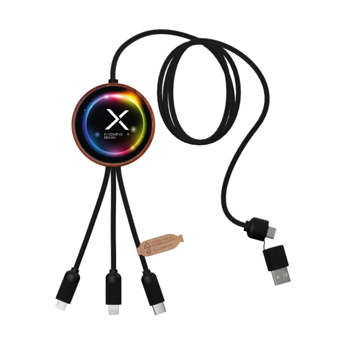 SCX.design C40 kabel ładujący z podświetlanym logo 5-w-1 rPET i z podkładką ładującą 10 W to nowoczesny, wszechstronny gadżet, który łączy w sobie ekologię i funkcjonalność. Wykonany z plastiku PET pochodzącego z recyklingu oraz bambusa, przyciąga wzrok eleganckim brązowym wykończeniem, a podświetlane logo sprawia, że każdy nadruk staje się miniaturową, mobilną reklamą. Dzięki mocy 10 W bezprzewodowej podkładki oraz potrójnemu złączu (USB-C, micro USB, iPhone) i podwójnemu USB, urządzenie jest gotowe obsłużyć większość smartfonów i akcesoriów 🔌.