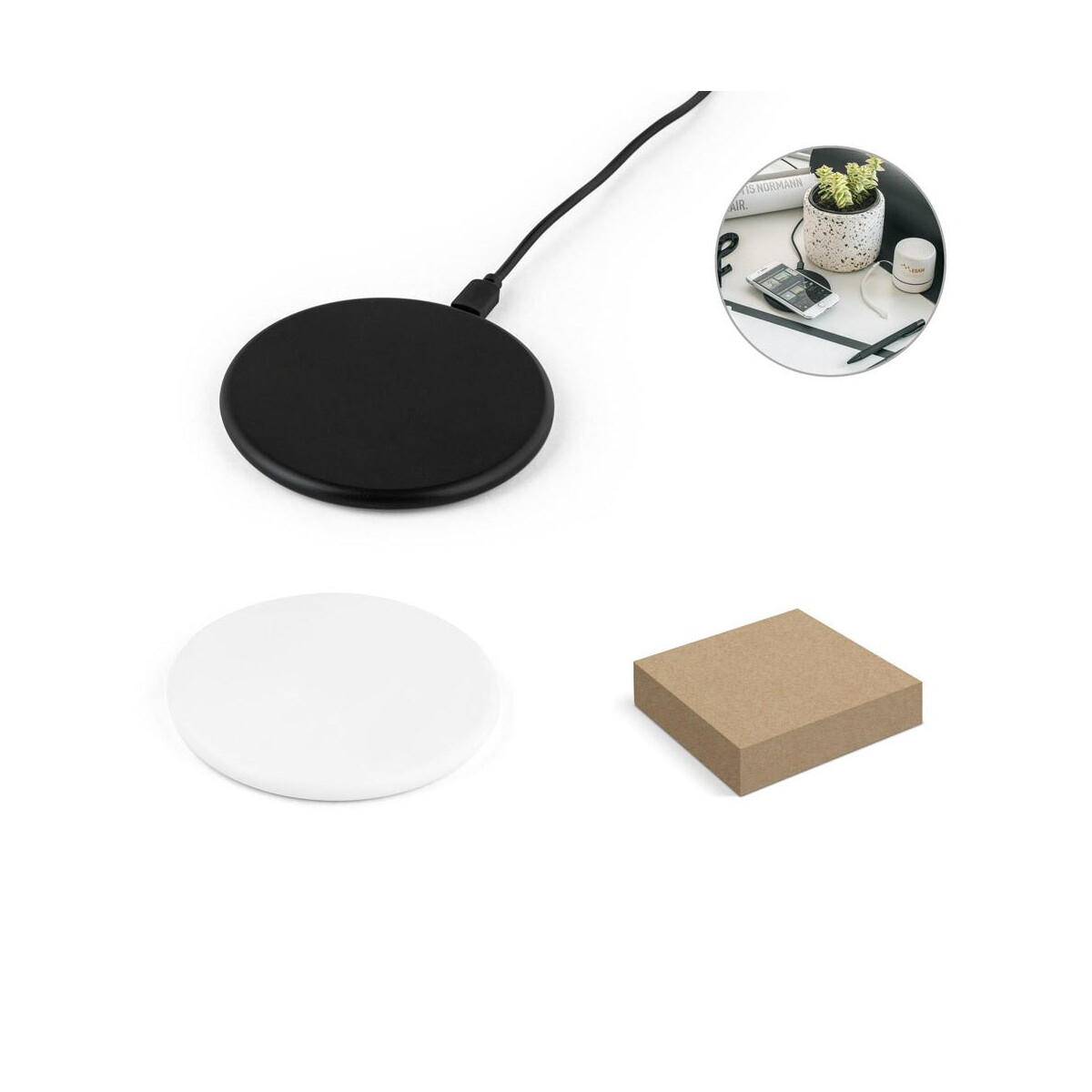 SOVERY. Superszybka ładowarka bezprzewodowa 10W wykonana w ABS pochodzącego z recyklingu (100% rABS) to znakomite połączenie nowoczesnej technologii, dbałości o środowisko oraz wyśmienitej przestrzeni na Twoje logo 📱. Model wyróżnia się minimalistycznym designem w eleganckiej bieli lub głębokiej czerni, dzięki czemu bez trudu wpisze się w styl biura, domu czy hotelowego lobby. Średnica ø99 mm, wysokość 8 mm i lekka konstrukcja o masie zaledwie 46 g sprawiają, że ładowarkę można wygodnie przenosić w plecaku lub torbie na laptopa, zachowując mobilność podczas konferencji lub podróży ✈️.