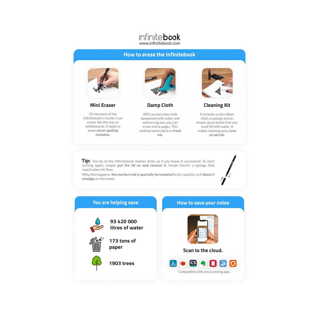 STARTER KIT INFINITEBOOK A5 PLANNER TEXTURE to nowoczesny, wielokrotnego użytku notes w twardej oprawie o wymiarach 148 x 210 mm, który pozwala planować, kreślić strategie i błyskawicznie wprowadzać zmiany. Dzięki specjalnym stronom, które po spryskaniu i przetarciu gąbką stają się znów czyste, zestaw jest gadżetem przyjaznym środowisku i portfelowi 😊. W komplecie otrzymujesz marker, uchwyt na długopis oraz cały zestaw do czyszczenia, więc możesz zacząć działać od razu po rozpakowaniu. System stron – od rocznego planera, przez miesięczne i tygodniowe widoki, aż po strony habit-trackera i kropkowane kartki – czyni ten produkt wymarzonym narzędziem zarówno do pracy, jak i do życia prywatnego.