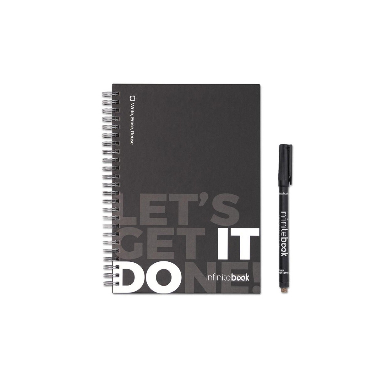 Strony z opatentowaną powłoką pozwalają błyskawicznie digitalizować notatki – wystarczy zdjęcie telefonem, by pomysły trafiły do chmury. STARTER KIT INFINITEBOOK. Zestaw „Infinitebook” w twardej oprawie, 1 zestaw do czyszczenia, 1 marker i 1 uchwyt na długopis w kolorze czarnym prezentuje się elegancko zarówno na spotkaniu biznesowym, jak i podczas wykładu. Wymiary 148 × 210 mm (format A5) ułatwiają transport, a jedynie waga 460 g gwarantuje odpowiednią sztywność twardej okładki.