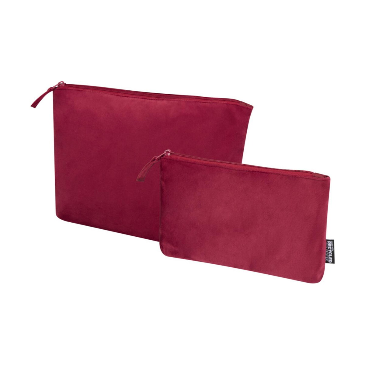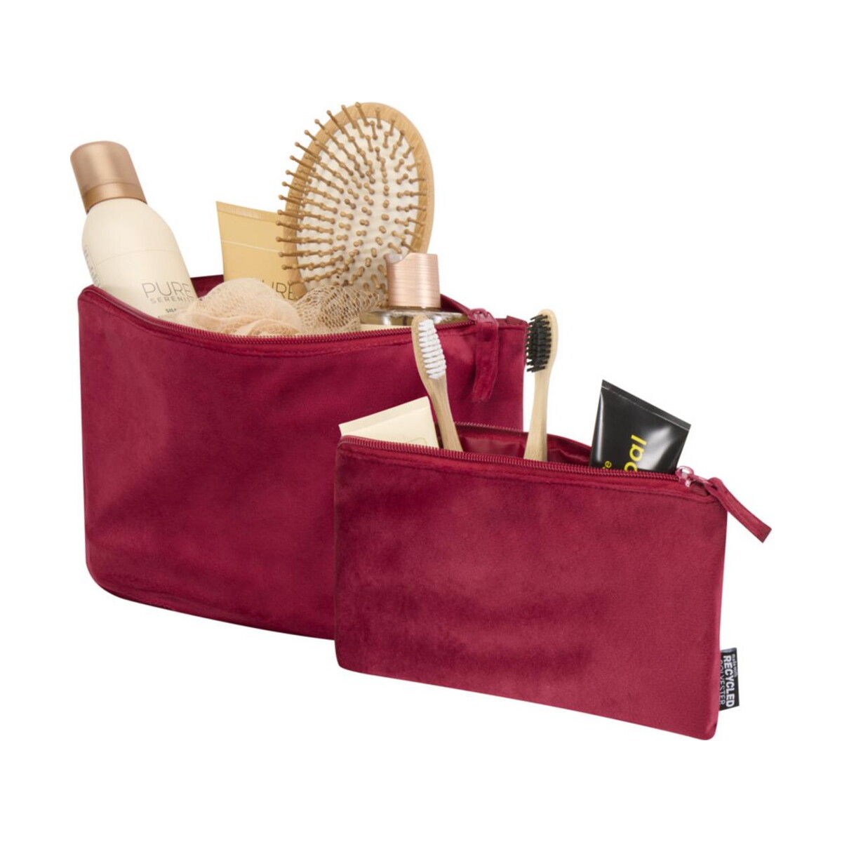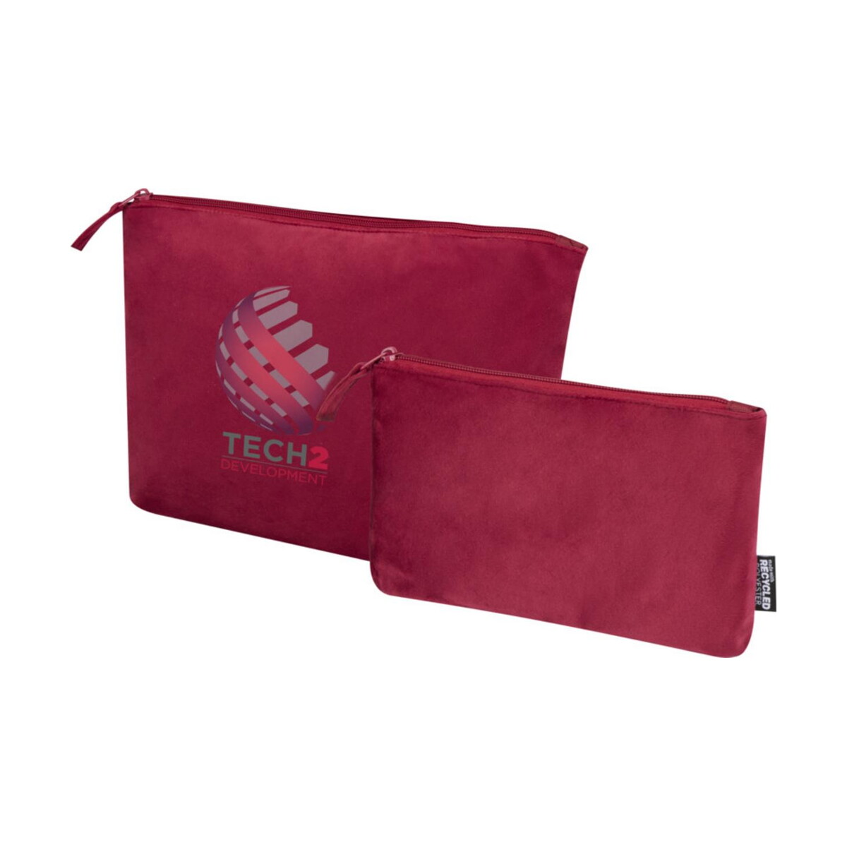 Zestaw obejmuje dużą i małą saszetkę służącą do uporządkowanego przechowywania akcesoriów. Wymiary: 32 × 21 × 8 cm (duża) oraz 23 × 13 cm (mała). Niezwykle lekka konstrukcja – waga zaledwie 95 g – sprawia, że łatwo zmieścisz je w torbie podróżnej lub plecaku. Materiał: wytrzymały, aksamitny GRS certified recycled polyester. Dostępne kolory: czerwony i zielony, które pięknie podkreślą firmowe barwy oraz logo nadrukowane techniką wysokiej jakości.