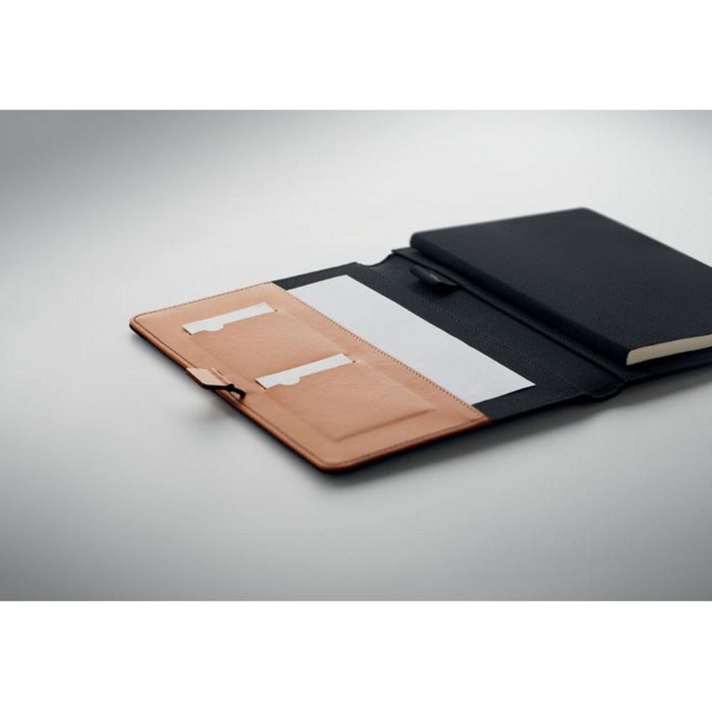 Model Teczka konferencyjna A5 RPET FEUX wyposażono w praktyczny uchwyt na długopis, 2 kieszonki na karty oraz jedną dużą przegrodę na dokumenty, co zapewnia znakomitą organizację wszystkich niezbędnych drobiazgów. Bezpieczeństwo zawartości gwarantuje elastyczny pasek z gustownymi metalowymi detalami, podkreślający nowoczesny charakter produktu. Głęboki czarny kolor to tło stworzone do personalizacji – Twój nadruk lub logo będzie prezentować się wyjątkowo elegancko i przyciągnie wzrok kontrahentów 👍.