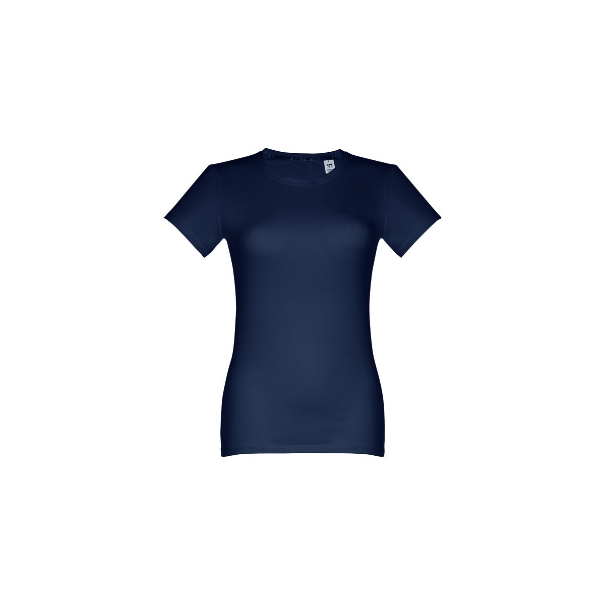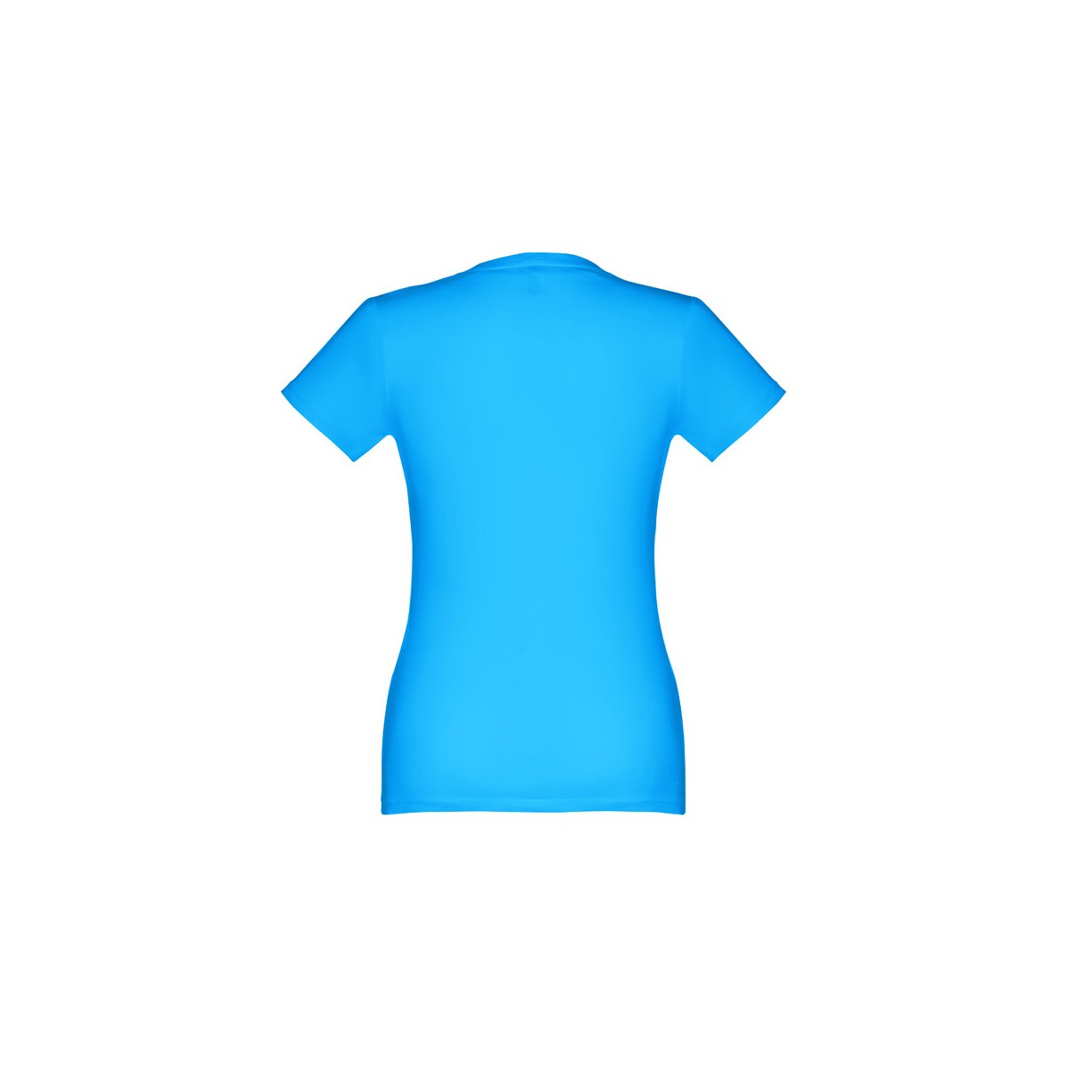 Damski t-shirt o dopasowanym kroju. 100% bawełna dżersej (190 g/m²) ze zgrzebną przędzą bawełnianą (kolor 183: 90% bawełna/10% wiskoza). Posiada cienki kołnierzyk z dżerseju wzmocniony satynową tasiemką. Zszywany po bokach, z podwójnym ściegiem na rękawach i na dole