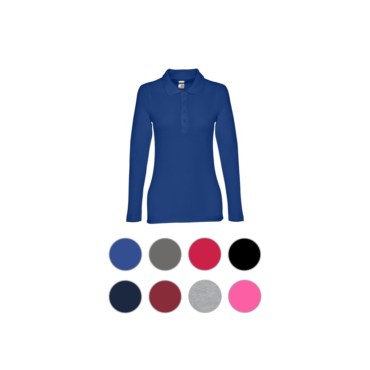 Damski t-shirt polo z długim rękawem ze 100% bawełny o splocie piqué (210 g/m²) ze zgrzebną przędzą bawełnianą (kolor 183: 85% bawełna/15% wiskoza). Prążkowany kołnierzyk jest wzmocniony taśmą piqué. Posiada 4 dopasowane kolorystycznie guziki (dodatkowy guzik umieszczony w szwie wewnętrznym). Zszywany po bokach, z podwójnym ściegiem na rękawach. Zdejmowana widoczna etykieta