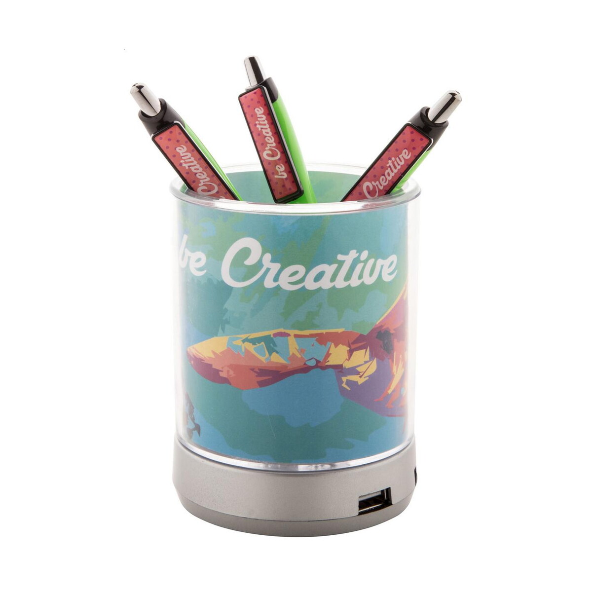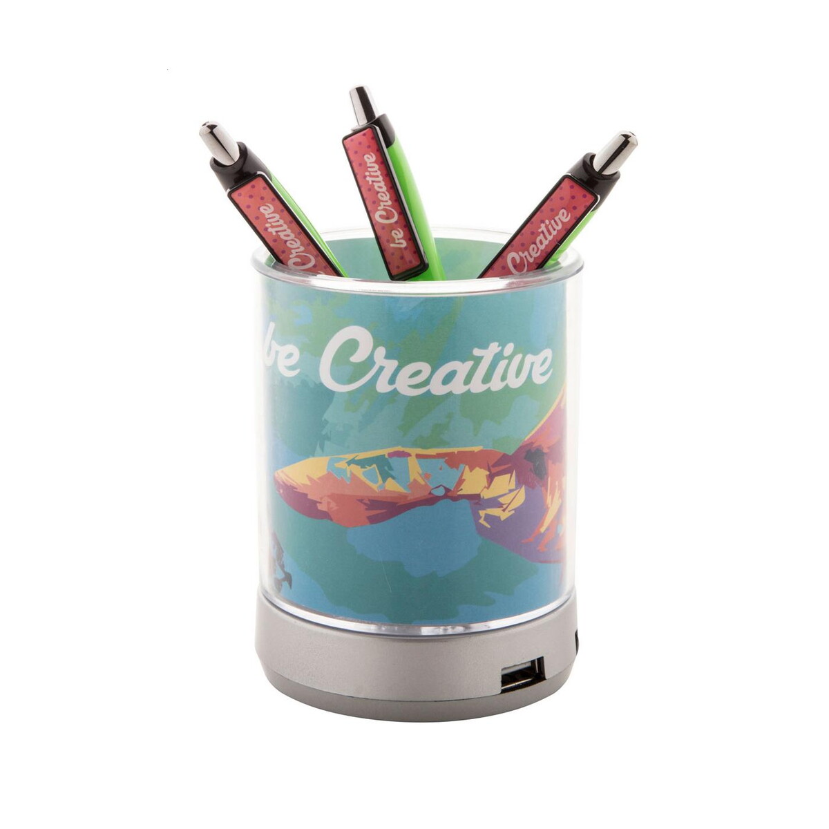 Tobi stojak na długopisy to niezwykle funkcjonalny, a zarazem designerski gadżet, który uporządkuje Twoje biurko i doda mu technologicznego blasku. W przezroczystej obudowie z wytrzymałego tworzywa ABS skrywa aż 4 porty USB, umożliwiające jednoczesne ładowanie smartfona, myszy czy powerbanku. Subtelne niebieskie podświetlenie LED tworzy przyjemną aurę pracy, a kompaktowe wymiary ø80×105 mm oraz niewielka waga 168 g sprawiają, że zmieści się nawet na najmniejszym blacie. Co więcej, tylna ścianka działa jako stabilny stojak na telefon, dzięki czemu film instruktażowy lub wideokonferencja pozostaną zawsze w zasięgu wzroku 😊.