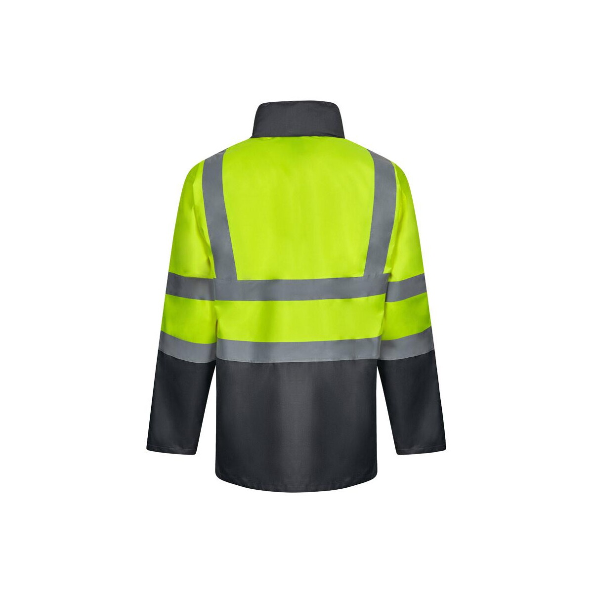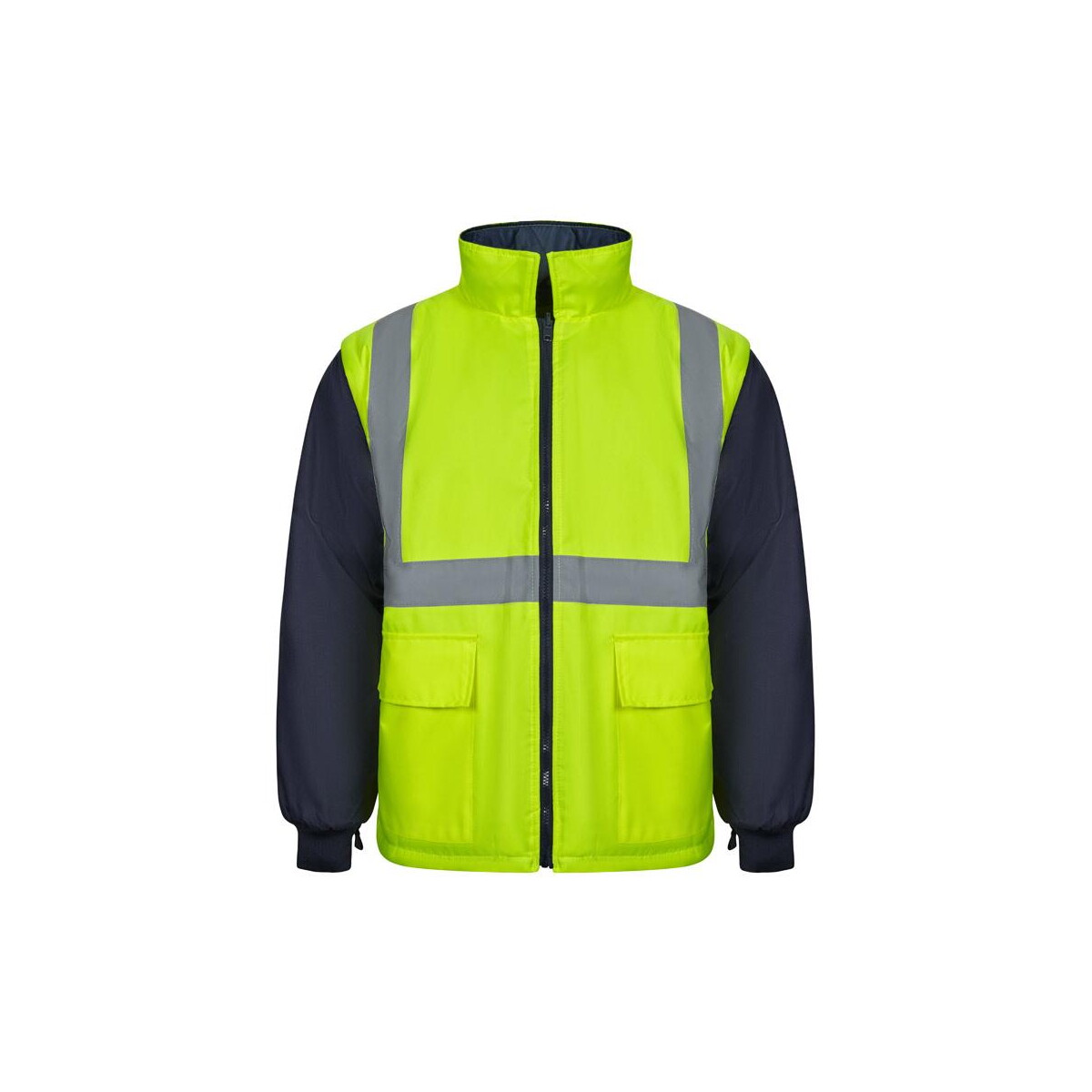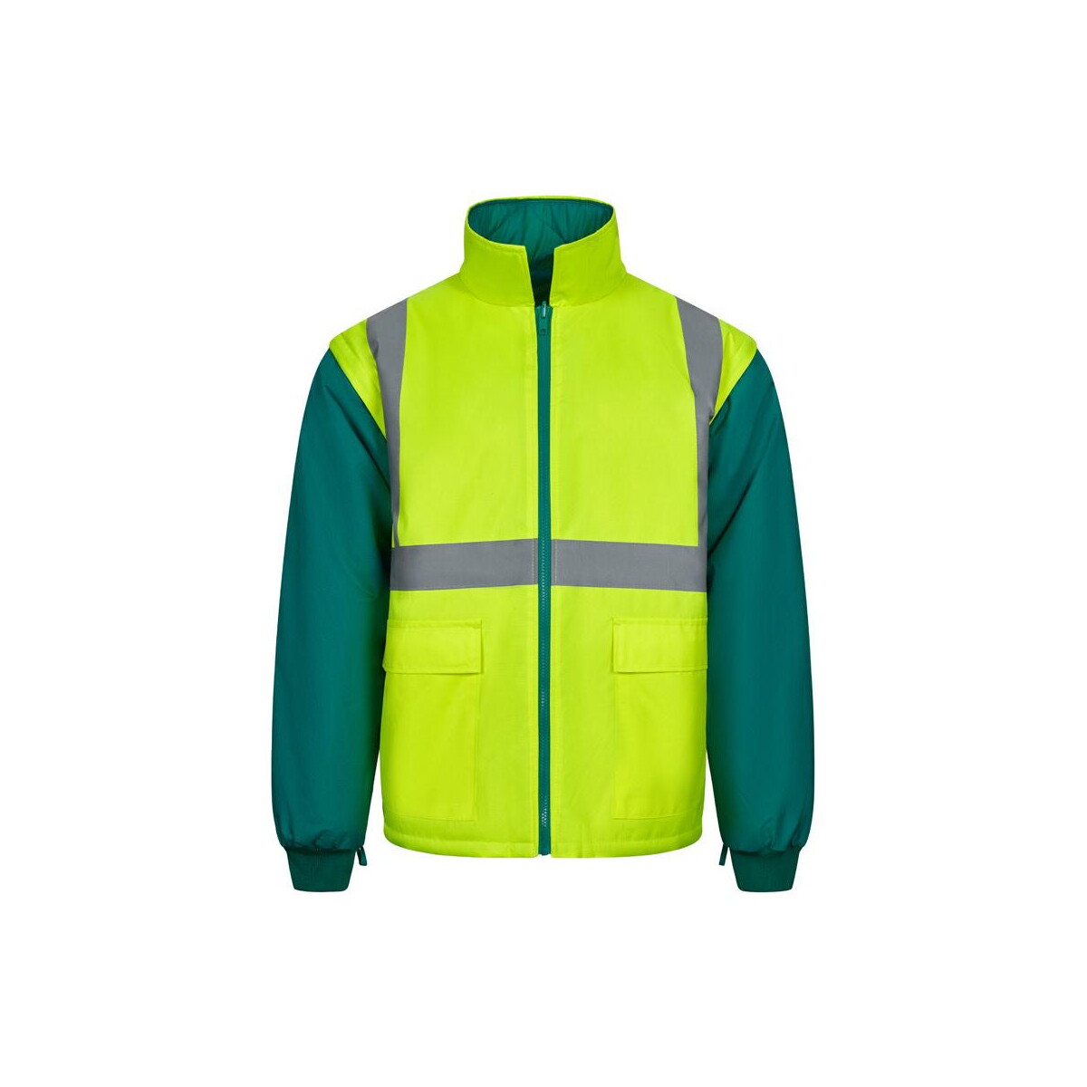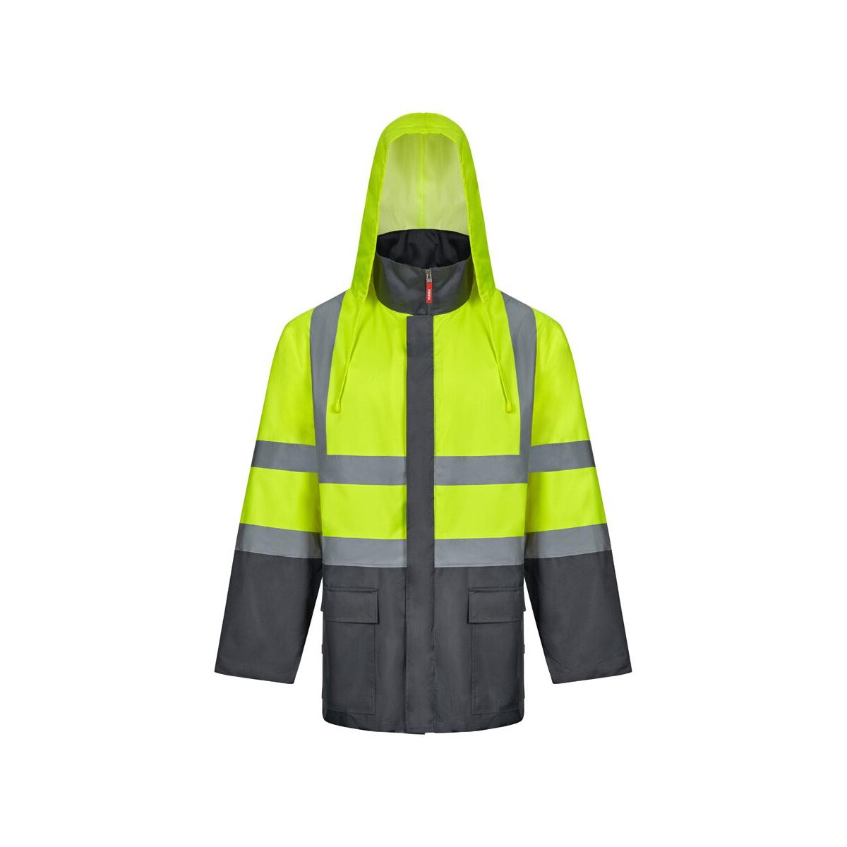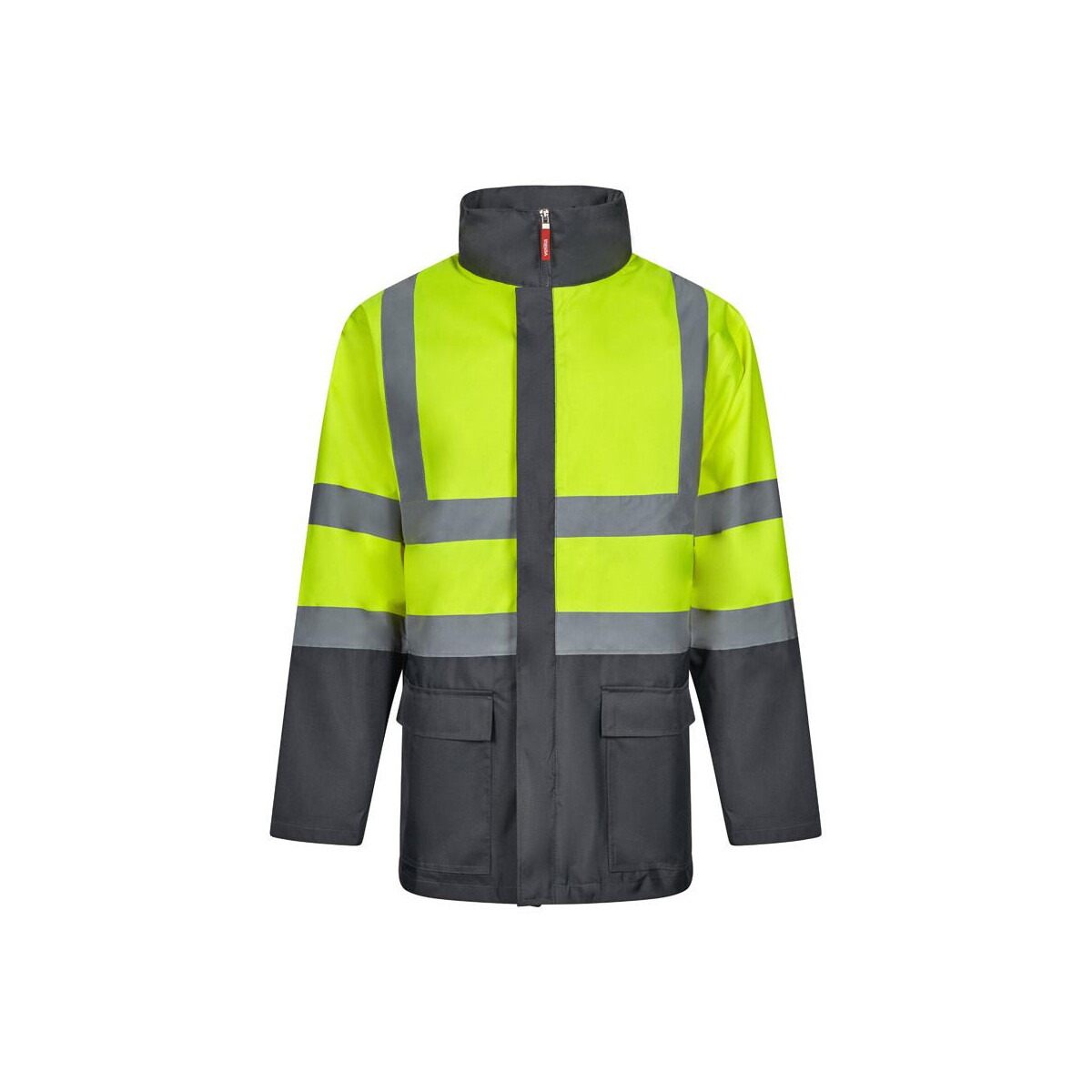 VL JUNO. Dwukolorowa kurtka 4 w 1 (180 g/m²) z poliestru (100%) z powłoką PU to wszechstronny, znakomity wybór dla marek stawiających na bezpieczeństwo i widoczność. Dzięki konstrukcji „cztery części w jednym” – parka, płaszcz przeciwdeszczowy, kurtka i kamizelka – jeden produkt zastępuje cały zestaw odzieży ochronnej. Wysokiej jakości poliester pokryty warstwą PU skutecznie izoluje od wiatru i deszczu, a odblaskowe paski umieszczone na tułowiu, ramionach i rękawach zwiększają widoczność użytkownika w każdych warunkach pogodowych 😊.