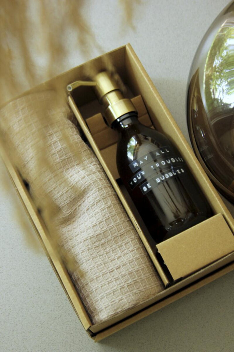 Wellmark Happy Home pudełko upominkowe to wyszukany, a zarazem niezwykle praktyczny prezent, który podbije serca odbiorców w branży wellness, beauty, hotelarskiej i szeroko pojętych usług korporacyjnych 😊. W zestawie znajduje się mydło do rąk o kojącym zapachu bambusa (pojemność 250 ml) oraz beżowa ściereczka z certyfikowanej bawełny organicznej, zapakowane w eleganckie etui wykonane ze szkła z recyklingu. Całość tworzy ekskluzywny gadżet reklamowy, który z łatwością przyciąga uwagę klientów oraz partnerów biznesowych.
