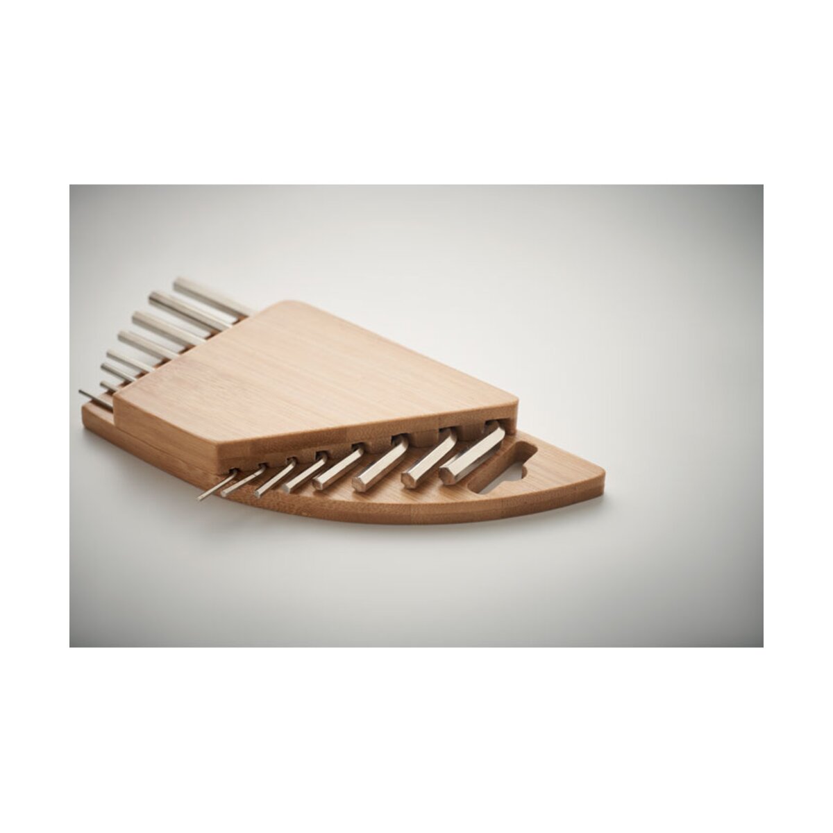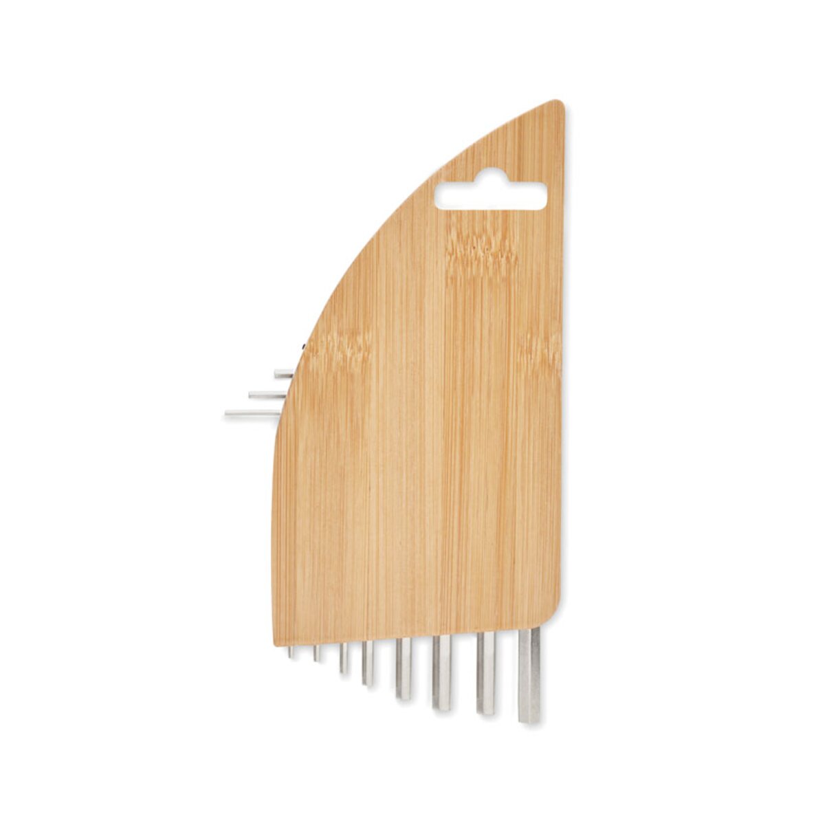 Zestaw kluczy imbusowych – KARUVI to praktyczne i estetyczne narzędzie, które idealnie łączy funkcjonalność ze stylem. Bambusowy uchwyt w stonowanym, brązowym odcieniu nadaje całości naturalny charakter, a dzięki możliwości nadruku logo staje się on efektownym gadżetem reklamowym dla Twojej marki 🙂. W skład zestawu wchodzą precyzyjnie wykonane klucze sześciokątne ze stali węglowej z powłoką niklową w rozmiarach 1,5 mm, 2 mm, 2,5 mm, 3 mm, 4 mm, 5 mm, 5,5 mm i 6 mm – to pełen przekrój rozmiarów najczęściej używanych w codziennych pracach serwisowych.